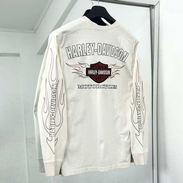 *90s할리데이비슨독수리플레임롱슬리브티셔츠입니다. 말이필요없는대장급매물입니다. 1년전홍대빈티지샾구매제품입니다. 빈티지 제품특성상의상태는이해해주시고구매해주세요. 미세생활오염, 부분사용감,구김존재.(사진상으로확인요망) 상태에예민한분은패스해주세요. XXL사이즈. 어깨-64cm 가슴-62cm 소매장-60cm 총장-72cm
