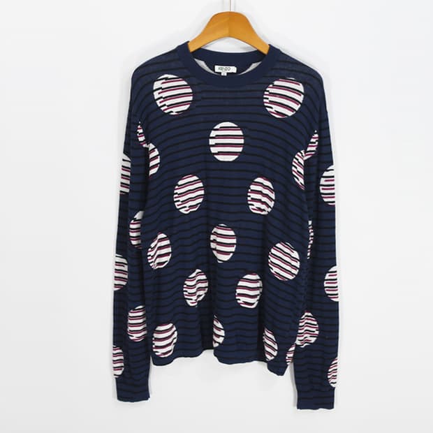 KENZO paris 코튼 니트 신축성 있는 코튼 소재 줄무늬 도트 패턴 표기 S 실측 사이즈 맨즈 S~M 정도 양호한 컨디션 총장 66 어깨 46 가슴단면 50 팔길이 66cm (재는 위치.방법에 따라 약간에 오차는 있을수 있는 점 참조)