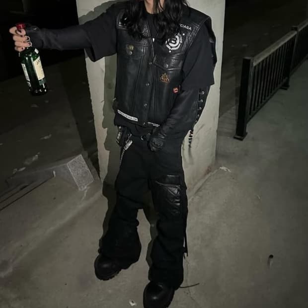 (2)emostanceclub 벨벳 레더 패널 와이드 카펜터 팬츠