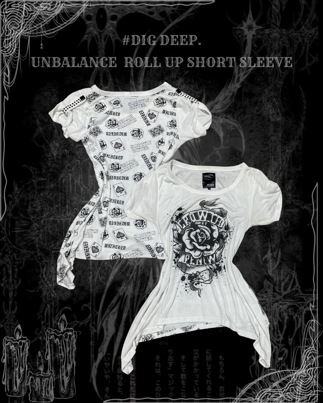 ✔️ 화려한 전,후면 프린팅 ✔️ 언발로 떨어지는 끝단 ✔️ 어깨 롤업 포인트까지 ✔️ 디그딥 특유의 디테일이 잘 살아있는 와투케&펑크 믹스 무드를 잘 보여주는 아이템입니다 🧚어깨35 총장62~70 가단 48 소매20