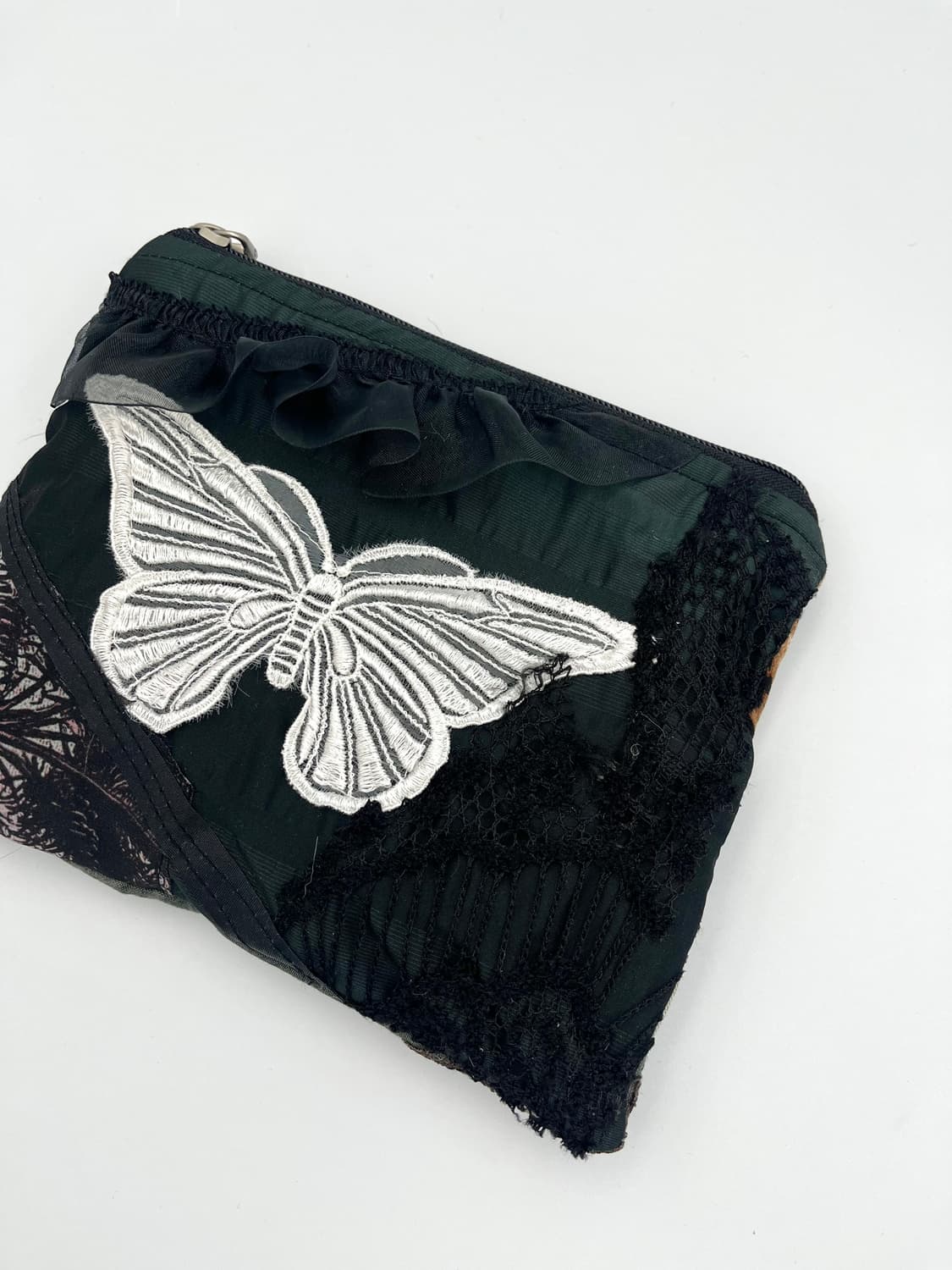 어두운 숲속의 공기는 차갑고도 스산합니다. 숲을 거닐다 마주친 하얀 나비 한 마리. 그 나비는 당신을 인도하는 수호신입니다. 누군가 내 삶을 책임져줬으면 하는 바람도 잠시, 결국 나는 나의 주인이기에 순간의 선택 속에서 삶을 스스로 개척해 나갈 수 있습니다. 나비는 과거의 내가 이끄는 길을 상징합니다. 소가죽, 아일렛, 호피무늬, 야자수, 나비 모티브 등 다양한 소재가 어우러져 하나의 작품이 되었습니다. 소셜미디어 속 스쳐 지나가는 쇼핑몰이나 공장에서 찍어내는 물건이 아닌, 사입과 판매를 넘어 이야기를 전하고 소통하는 그런 공간이 되고 싶습니다. 19.5*16cm Only one 솔드아웃시 유사한 무드로 제작 가능합니다.