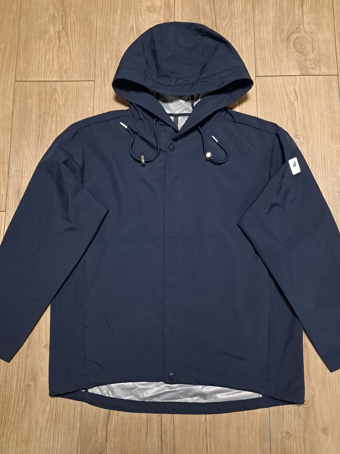 깨끗합니다 생활방수 사이즈95 (95~100) 오버핏 가슴59 총장62/69 어깨50 팔55 폴리에스터 가볍고 매끄러운 재질 포켓2 (지퍼) 하단 스트링 후드 일체형 네이비