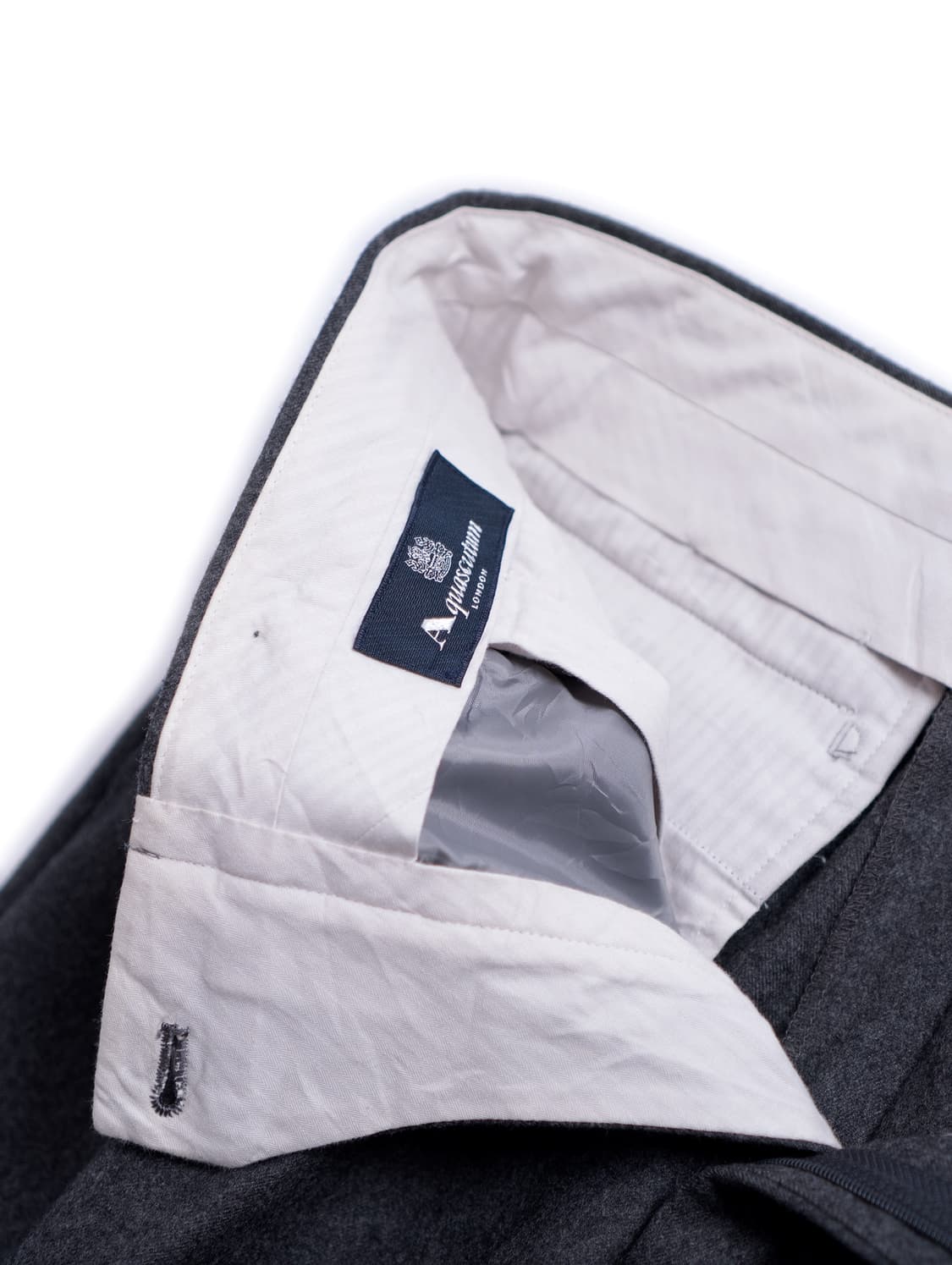 Details - Made in Japan - Wool 100% - High Weist - Double Forward Pleats 1853년 모직물 생산을 시작으로 영국 럭셔리 브랜드로 성장한 아쿠아큐스텀사의 투 턱 울 트라우저스 입니다. 더블 플리츠 하이웨스트 사양과 사계절 입기 좋은 두께의 원단으로 편안한 착용감과 풍성한 실루엣을 가지며, 그레이 칼라로 다양한 코디에 활용하기 제품입니다. Size (cm) 허리 42(32“) 밑위 34 허벅지 32 총장 100 밑단 22