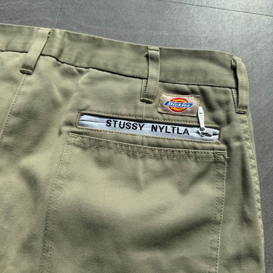 2707 stussy x dickies carpenter short 사이즈 -34in 기장 54 허리 43 허벅지 30 밑단 25 ₩80,000 표기 32in, 실측 34in