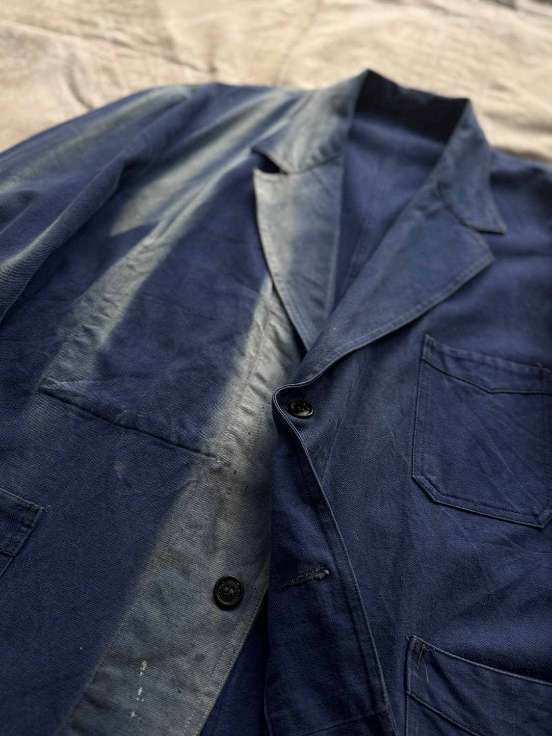40년 프랜치 워크 자켓으로 블레이져 형태의 모델입니다. 코튼 트윌 원단으로 몰스킨보다는 저렴하게 판매되고 있지만, 코튼 트윌만의 거칠고 몰스킨보다는 가볍게 입을 수 있는 매력이 있습니 다. 보기드문 독특한 페이딩이 들어가 있고, 카라 형태도 비교적 넓은 형태을 띄고 있어서 다소 레어한 개체라고 할 수 있겠습니다. 카라 라펠이 비교적 넓어서 클래식한 착장으로도 매우 잘 어울릴만 하며, 캐주얼하게도 편하게 입기 좋습니다. 넉넉한 사이즈로 국내 105정도 사이즈로 보시면 될 것 같습니다. 블레이져 형태의 워크자켓을 찾고 계셨던 분들에게 좋은 선택지가 아닐까 싶습니다. Size measurements 어깨 50 가슴 59 소매 64 총장 77