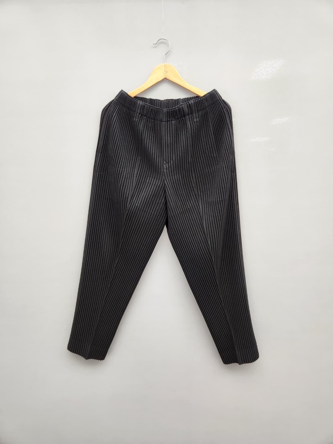 옴므플리세 플리츠 크롭팬츠입니다 롱자켓이랑 선물받은건데 잘 안입고 보관기간만 있었네요 컨디션은 당연히 좋습니다 사이즈 1이고 30~35 정도까지는 허리밴딩 이라서 가능합니다 허리단면 40 , 늘리면 54 정도 기장은 93~4 정도 나오네요 참고해주세요
