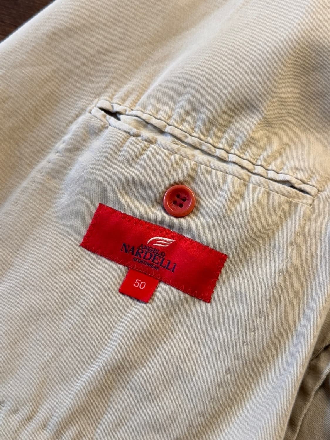 나폴리탄 자켓들이 보여주는 둥근 곡선미와 코튼과 린넨으로 직조된 고급스러운 패브릭이 인상적인 안젤로 나르델리의 스포츠코트입니다. 나폴리탄 자켓들이 지닌 디테일을 차분히 간직한 모델로 비교적 포멀한 차림의 세퍼레잇을 우선 추천드립니다만 깔끔한 데님이나 플리츠 잡힌 테이퍼드핏 치노와 함께도 근사하겠습니다. 사이즈 이탈리아 50 국내 100ㅡ103 추천합니다. 감사합니다.
