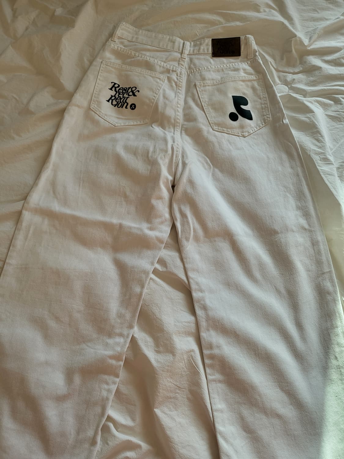 레스트앤레크레이션 와이드 플레어 진 흰색입니다 2번입은거 구매했는데 생각보다허리가 작네요 받자마자 세탁해놨고 밑단도깨끗합니다. 반값택배 2500원 일반택배 3800원