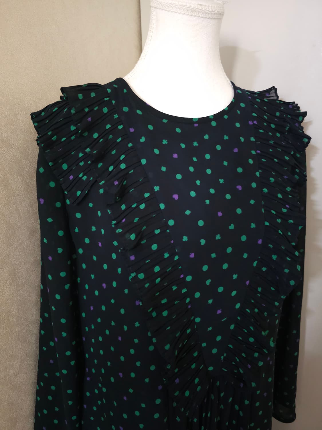 앳코너 프릴 쉬폰원피스 66사이즈 가슴반품 51cm 총장 105cm 무릎 완전히 덮는 미디기장입니다 사용감 별로없어요 네이비색상에 녹색, 보라색 도트입니다