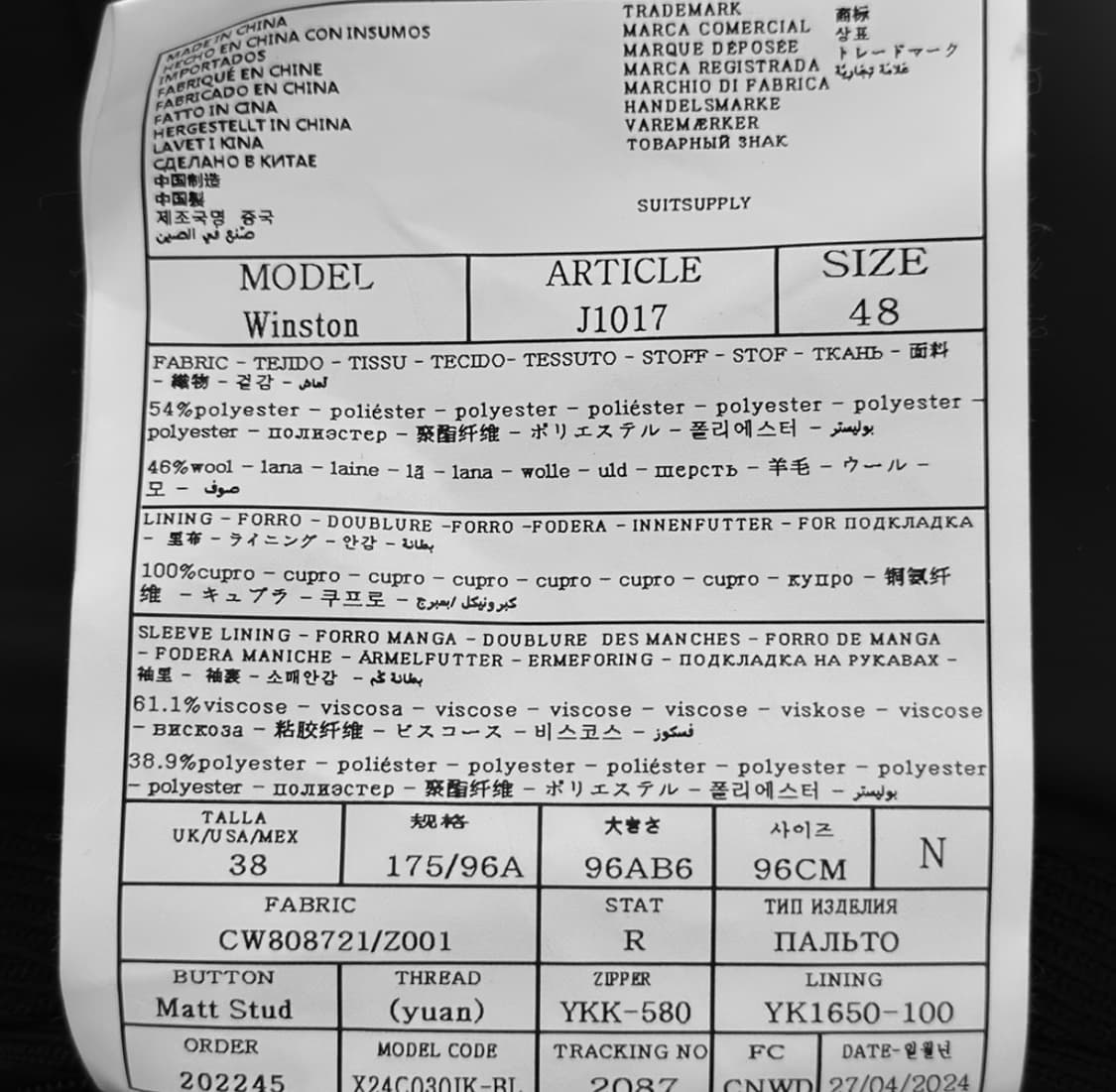 - 브랜드 : SUITSUPPLY - 모델명 : X24C030JK-BL - 컨디션 : A+ - 사이즈 : 48 실측 사이즈: 총장 (카라끝) : 71cm 총장 (카라밑) : 67.5cm 가슴 : 56cm 어깨 : 45cm 소매 : 64cm - 재질 : Polyester 54% + Wool 46% - 색 상 : Black - 구성품 : 본품 + 수트케이스 - 상세설명 : - 수트서플라이 24ss 윈스턴 보머 자켓 - 24ss 공식 홈페이지 발매 가격 118만원 - 수트서플라이의 상위 라인인 윈스턴 모델 - 구매 즉시 착용 가능한 컨디션