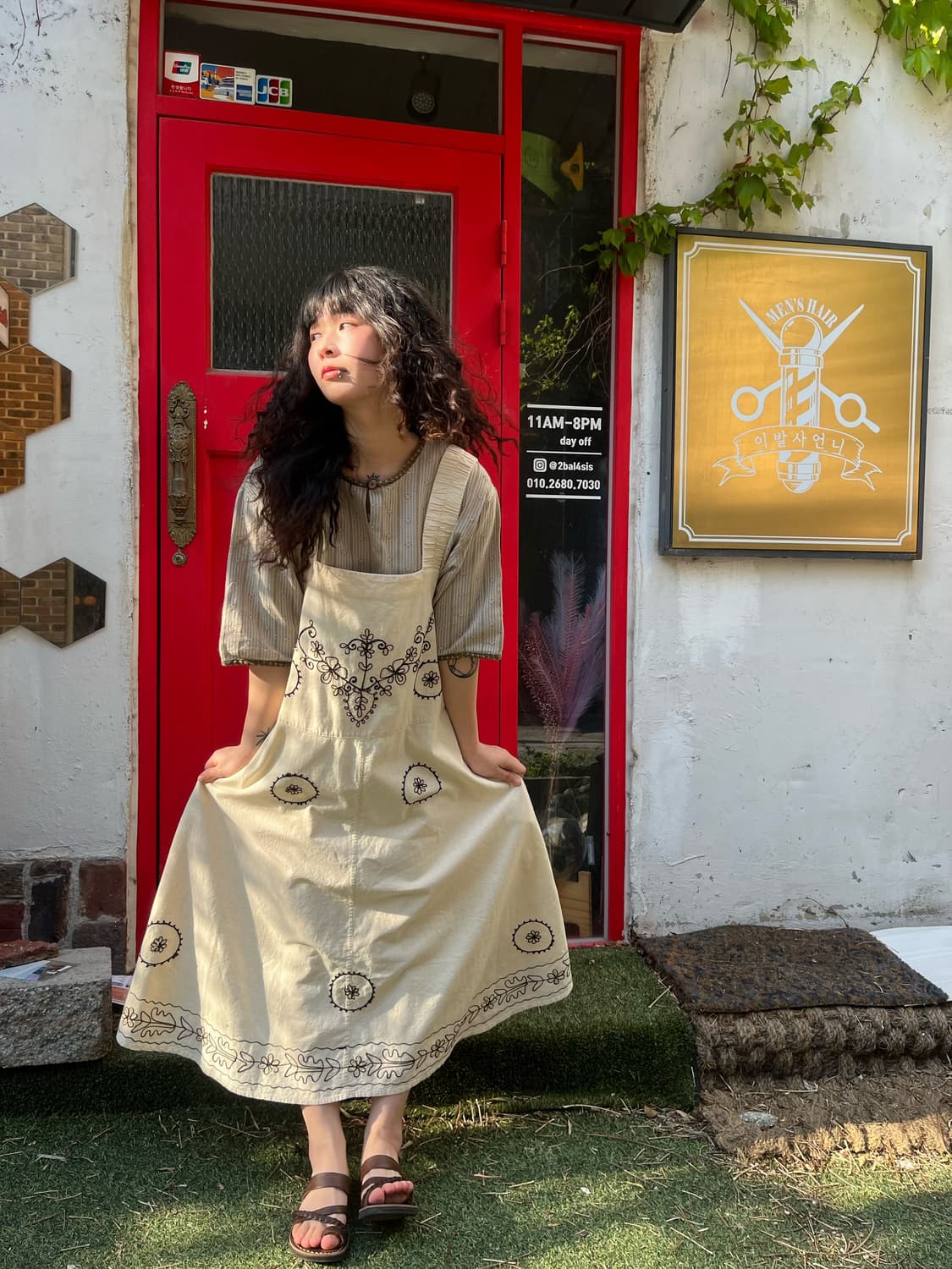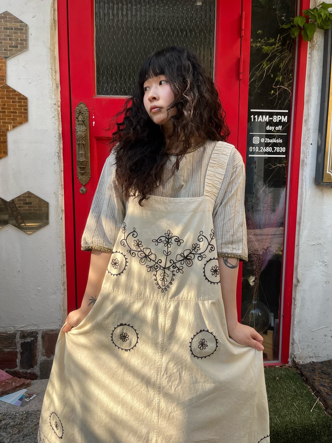 귀여우면서 데일리로 착용하기 좋은 크림같은 아이보리 컬러감에 히피느낌나는 자수 포인트로 반팔에 가볍게 착용하기 좋은 멜빵 원피스입니다:) (총장 114cm/ 가단 48-52cm) ꕥ어깨끈&사이드 밴딩ꕥ