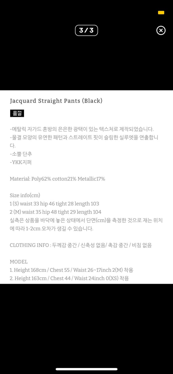 코스모스 자카드 팬츠 화이트 2사이즈 현재 사이트에서는 판매하지 않아 소장 가치 있는 상품. 블랙만 디테일 / 사이즈 이미지가 있어 참고하시면 됩니다. 선물 받았었는데 사이즈 미스로 3회 미만 착용 밑단 오염 있으나 세탁하면 괜찮을 것 같습니다. 그외 하자 없고 깨끗합니다.