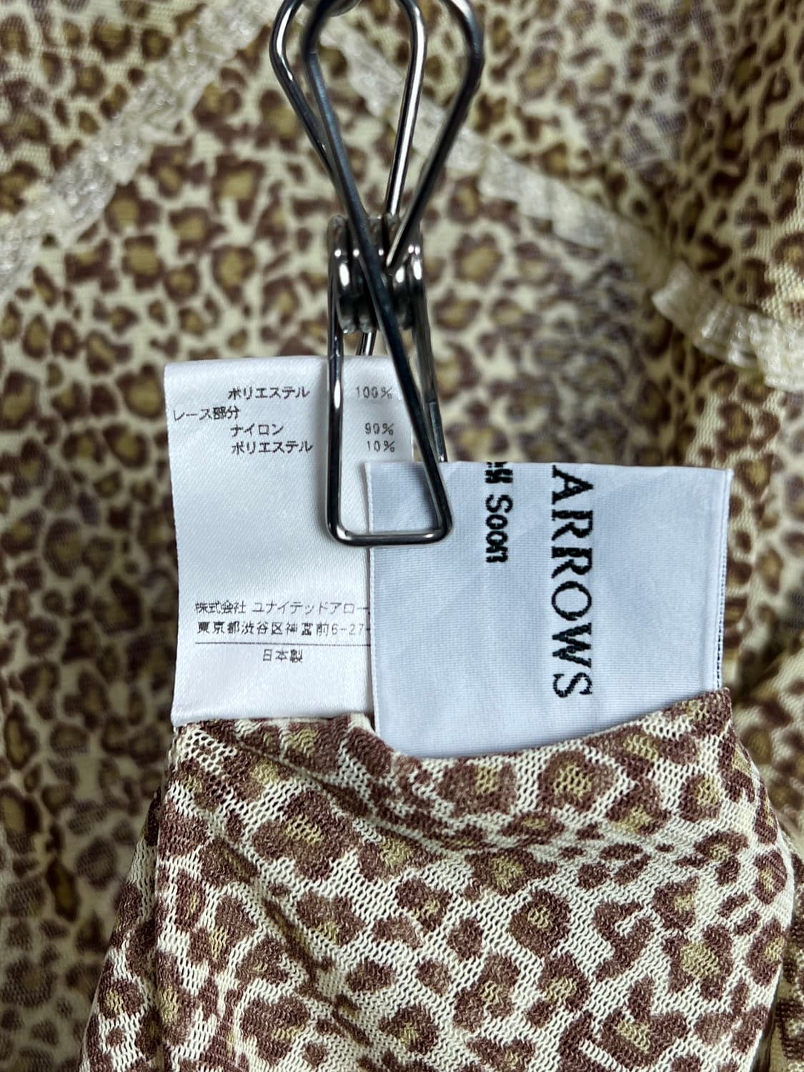 10938 가슴38 총장52(cm) 유나이티드 에로우즈 get well soon 레오파드 슬리브리스 입니다. 폴리 소재이며 조절 가능한 어깨끈, 레이스 디테일 등이 특징이네요. 사이즈는 실측을 참고해 주세요!
