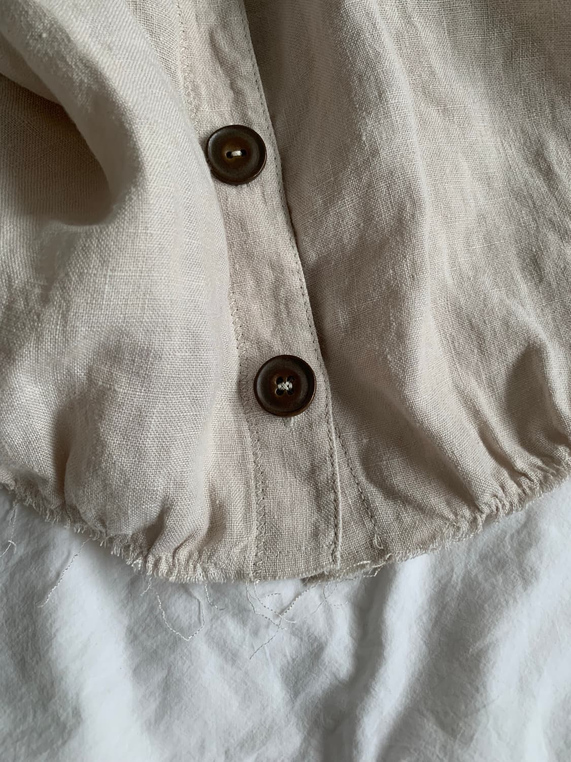 * condition A * size(cm) 총장 37 / 가슴단면 42 * 면 100% ◛⁺⑅ 러프한 마감과 소재에 사랑스러운 디자인이라니! 직접 만든 딥한 브라운 컬러의 도자기 단추를 달았답니다 ⭑⋆˙ 귀여운 크롭 기장으로 슬리브리스 위에 가볍게 걸치기 좋아요!