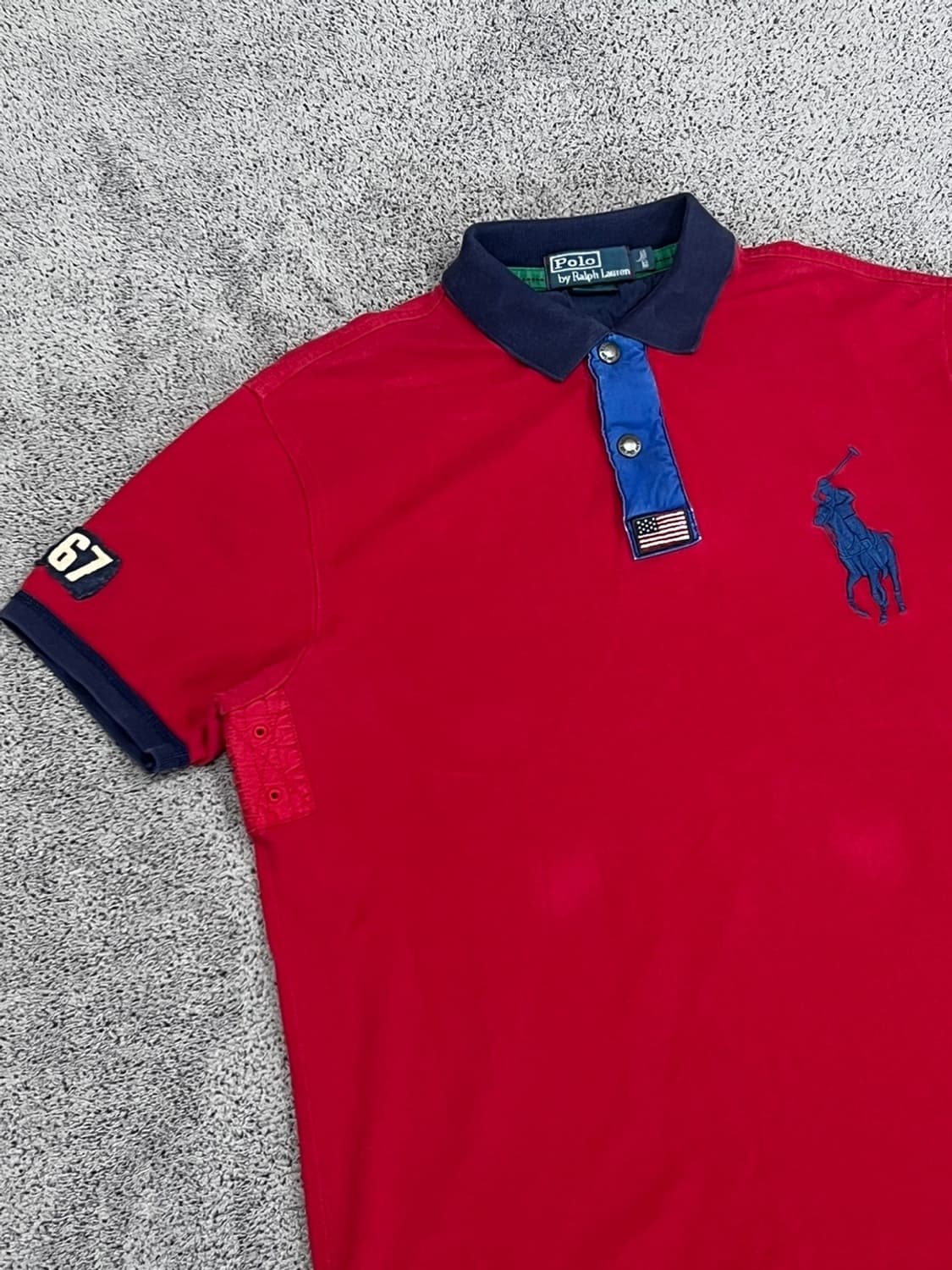 폴로 커스텀 핏 빅포니 성조기 카라 티 실측 사이즈 : L 가슴단면 : 58 총장 : 73 컨디션 :10/8 하자나 이염 여부 : X 택배비 별도 + 4,000
