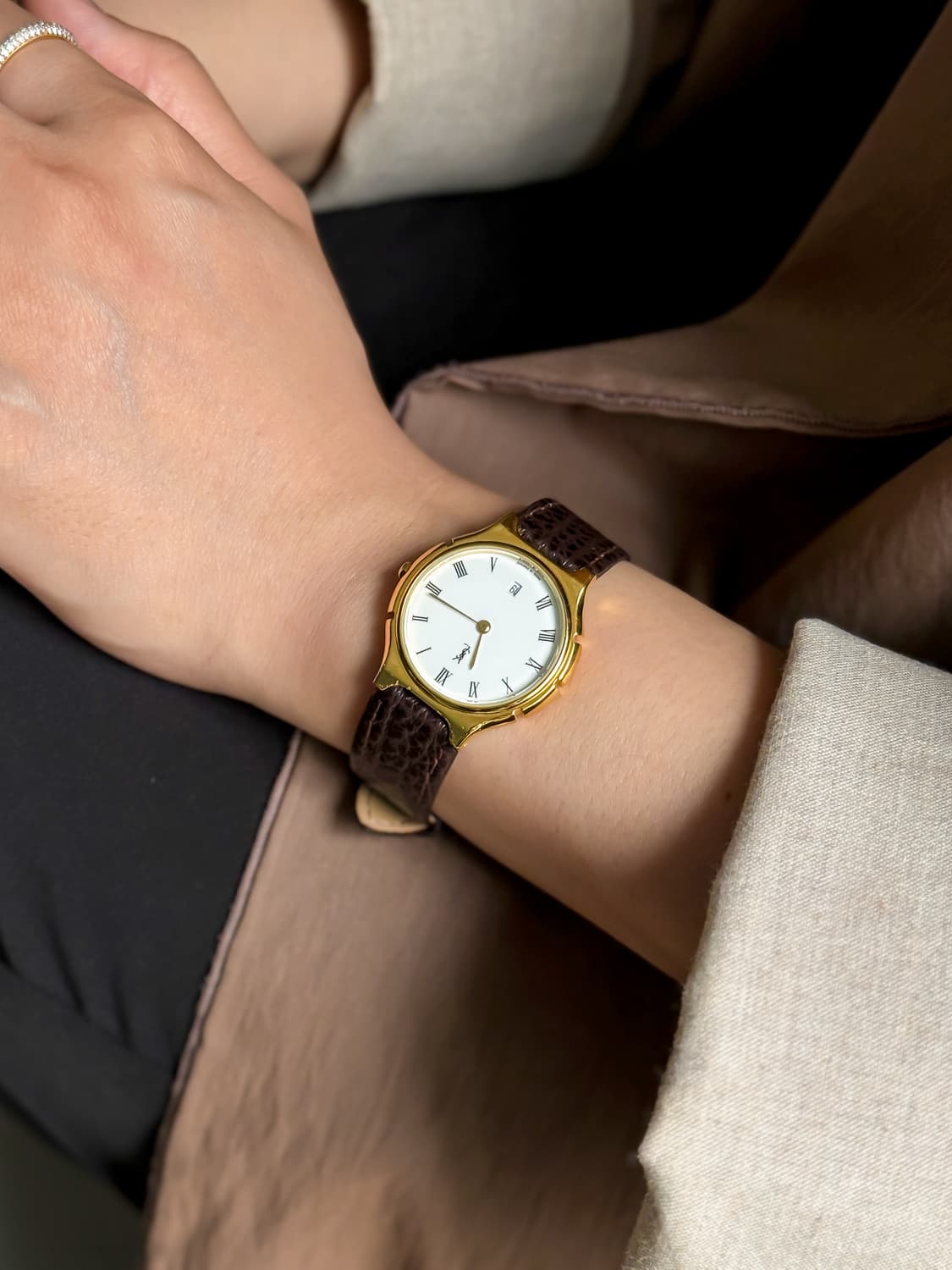 [𝒀𝑺𝑳] Gold round unisex watch 시원하면서도 뚜렷하게 느껴지는 깨끗한 화이트 다이얼과 골드의 심플하면서도 클래식한 매력이 가득한 YSL 시계입니다🤎 ➿ size : 2.9cm X 2.9cm ➿ 손목 : 15.5cm ~ 19.8cm ➿ quartz 쿼츠 ➿ 배터리 교체 및 내외부 점검 완료 ➿ comdition : A ➿ 사제 시계 상자 “시간이 지나도 가치를 잃어버리지 않는 당신 곁에서 오래도록 함께하는 위드유빈티지” - instagram : with_u_vintage - Blog : 위드유빈티지 With U Vintage (https://m.blog.naver.com/withuvintage) - 배송비는 전지역 무료입니다. - 정품 보증서가 필요한 고객님께서는 별도의 요청 부탁드립니다. (국내명품감정원 발급비용 40,000원) - 정품이 아닐 시 100% 환불 약속 드리겠습니다.