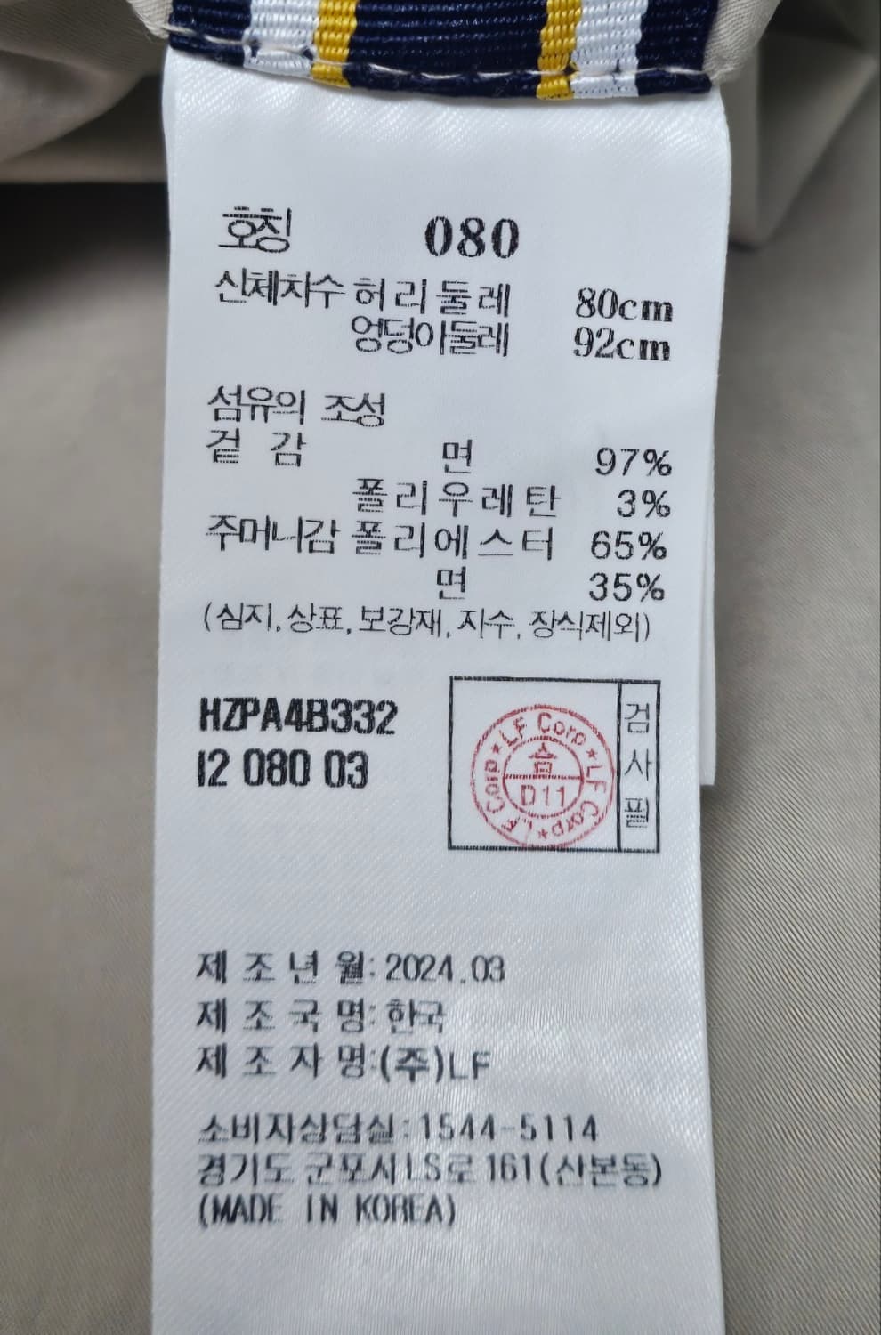 헤지스 남성바지 치노 크롭팬츠 베이지색상 면97%소재 봄여름용. 신축성좋음 80사이즈 허리31인치 (단면40) 기장101 세탁한상태 상태좋음