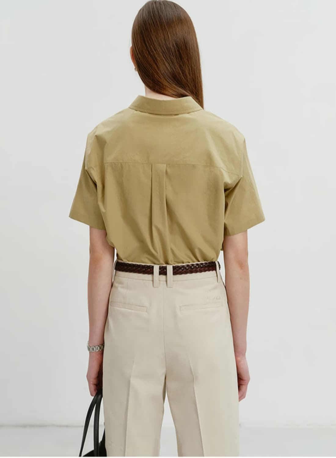사이즈 M 컬러 올리브 가슴단면 53cm 길이 49cm(어깨 끝부터) 한여름에도 가볍게 착용할 수 있는 세미 크롭 기장감의 써머코튼셔츠입니다. 크롭한 기장감이 여성스러우면서도 스타일리시한 무드를 보여주는 소장가치 있는 아이템이에요