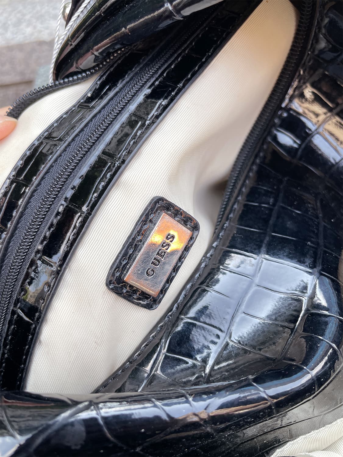 ——————————————- - 게스의 블랙 페이턴트 숄더 백입니다. - 바이커 스타일의 링, 스터드 디테일 - Faux Patent Leather - 스트랩 등에 부착할 수 있는 G 체인 참 - 약간의 사용감, 어깨 스트랩에 크랙이 있으니 확인 부탁드립니다. (컨디션 8.5/10) 사이즈 가로 37cm 세로 19cm ——————————————- no. 3820 ▫️평일 오후 2시 이전 주문 시 당일 출고 ▫️구매 혹은 문의 원하시면 편하게 메세지 주세요~ ▫️빈티지(중고) 의류인 점 감안해주세요. ▫️미리 안내드린 부분외에도 오염, 하자가 있을 수 있으며 결제 완료 시점 이후로는 교환 환불이 어렵습니다. #guess #y2k #게스 #바이커백 #페이턴트 #에나멜 #숄더백