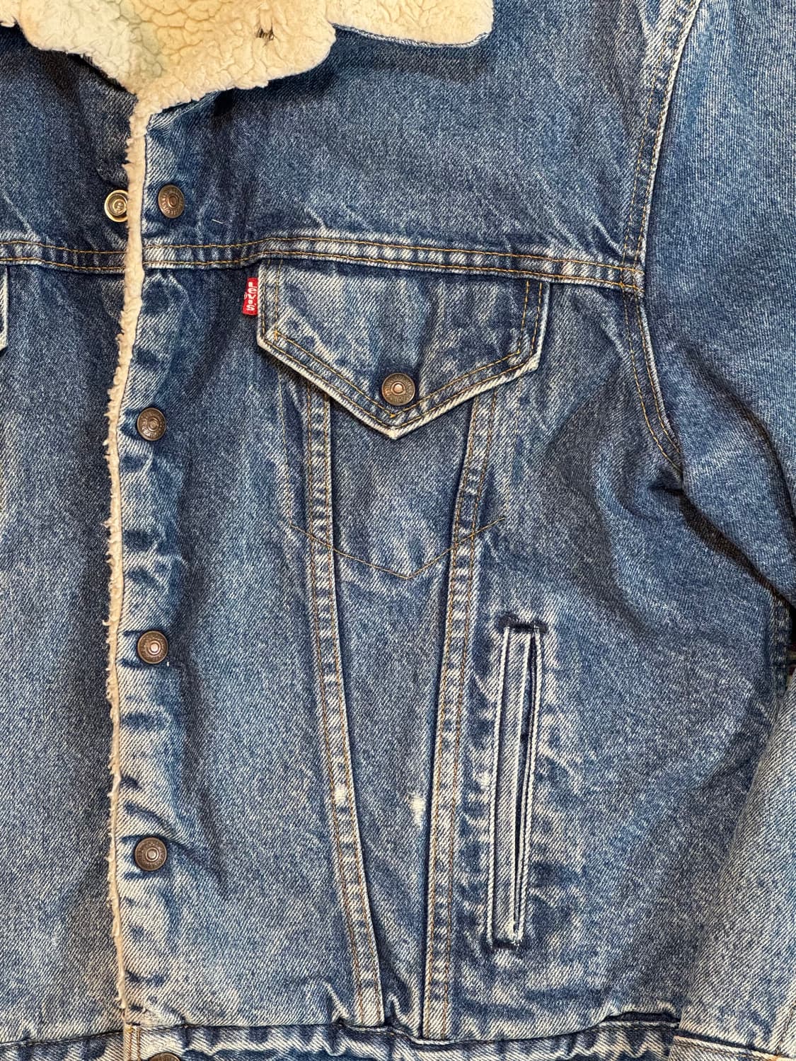 80년대 생산된 리바이스 쉐르파 트러커 자켓입니다. Made in USA시절의 리바이스는 현행에서 출시되는 리바이스들과는 차원이 다른 퀄리티를 보여줍니다. 데님팬츠는 물론이고 이 자켓또한 쉐르파 털의 밀도도 훨씬 높고 데님원단 또한 탄탄하며 페이딩이 예술이죠. 라이닝이 들어가있는 자켓의 고질적인 문제인 안감훼손도 없는 상태로 그 외에도 큰 하자나 데미지없는 상태로 입고 되었습니다. 모쪼록 누려주십사. 장사꾼 같은 말이지만 이런 오리지널 빈티지는 오늘이 제일 쌉니다. 표기 42R (L-XL) 어깨 51 가슴 60 기장 61.5 . . . Price: 180,000