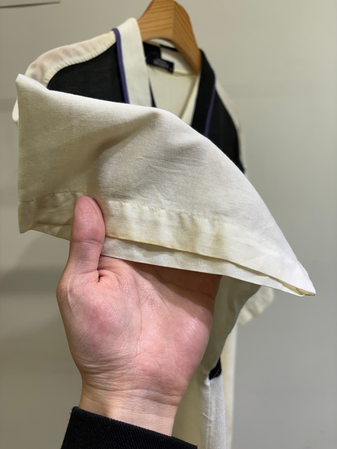 빈티지 상품 상품 컨디션 : B 소재 : 면 70%, 마 30% 표기 사이즈 XL Made in Japan 사이즈 실측 (단위 : cm 단면 기준) 어깨 56 / 가슴 62 / 소매 25 / 총장 80