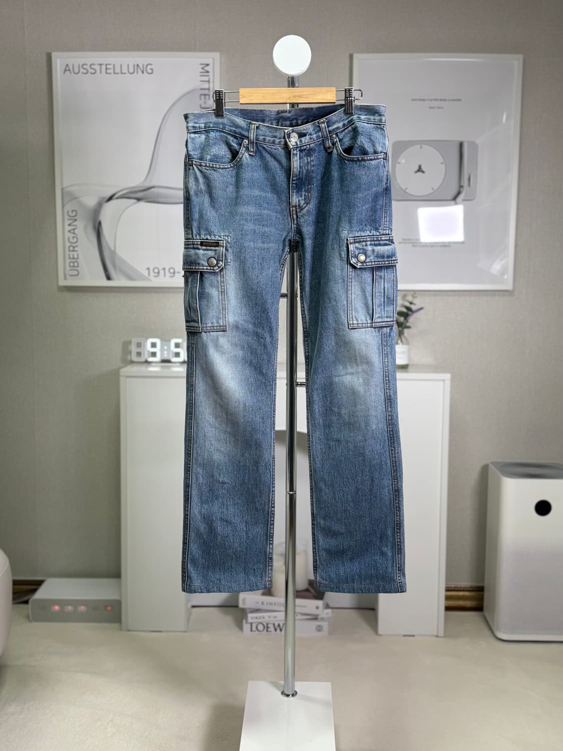 히스테릭 글래머 특유의 반항적인 무드가 잘 녹아 있는 카고 디테일 데님 팬츠입니다. 전면부 양쪽의 플랩 포켓과 힙 포켓의 웨스턴 디테일, 그리고 백 요크 라인의 곡선 등이 이 브랜드 특유의 미학을 보여줍니다. 전체적으로 Y2K 초중반의 스트리트 무드가 잘 살아있고, 데님 워싱도 과하지 않게 잘 빠졌습니다. ‘Hysteric Heavy’ 라인으로, 원단과 봉제 퀄리티 모두 우수합니다. 실측 사이즈 (cm) 총장 91 / 허리 39 / 허벅지 24 / 밑단 18.5 빈티지 특성상 교환 환불 불가합니다. 신중히 고민 후 구매 부탁드립니다🙏 택배비 포함 된 가격입니다. #히스테릭글래머 #카고팬츠 #스트레이트핏 #히스테릭데님 #재팬빈티지