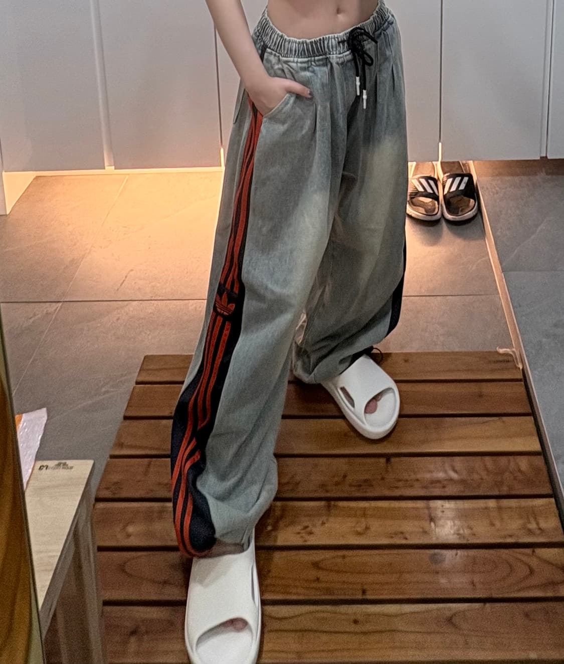 아디다스 커스텀 데님 바지입니다 키가 작아서 너무 길어서 못 입어서 팔아요 ㅠㅠ 160정도만 돼셔도 잘 맞으실거예요🥲 한번도 안 입어봤습니다🥹 15에 샀어요...