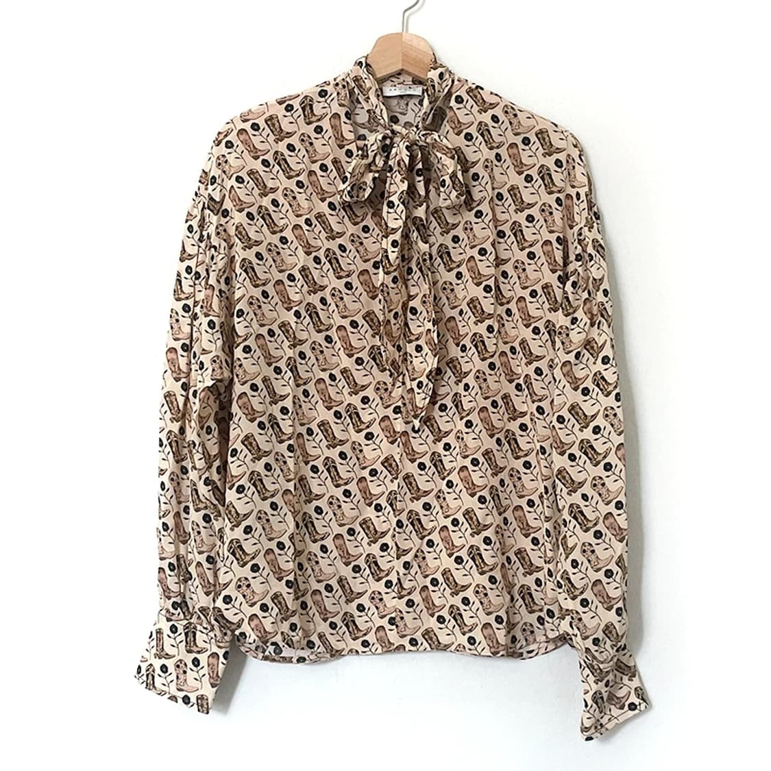 (새상품) 산드로 카우보이 부츠 프린트 타이넥 블라우스 2사이즈 베이지색 바탕에 카우보이 부츠 프린트가 가득한 블라우스에요 타이넥이라 리본 혹은 그냥 푸르고 입어도 예쁘고 100% 비스코스 소재라 부드러워요. 택있는 새상품이라 선물도 가능하답니다