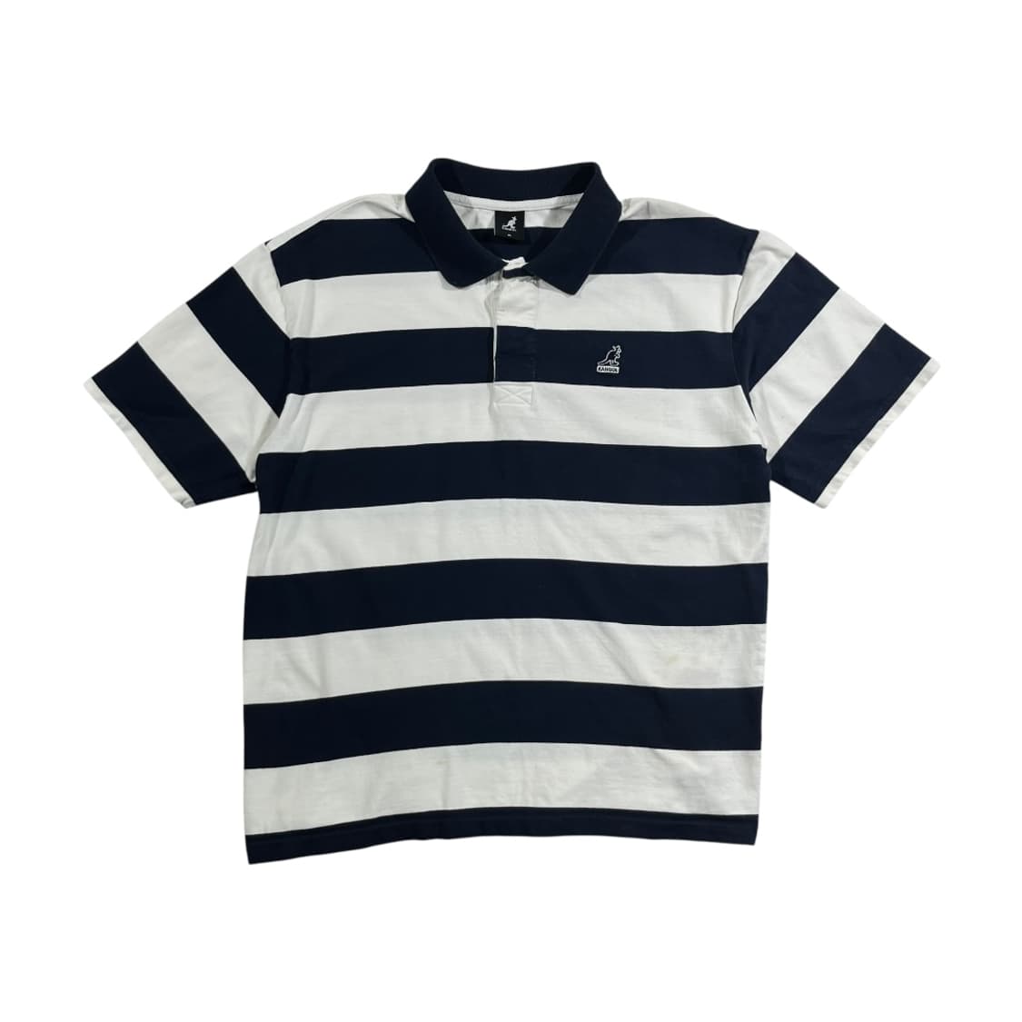 [Kangol] 캉골 스트라이프 카라 반팔 티셔츠 ₩ 9,000 ✔색상: 네이비×화이트 ✔주 소재: 면 ✔사이즈: 어깨/가슴/팔/총장 ✔ XL: 54/57/25/69 *전체적인 오염이 존재하여 세탁비를 감안한 가격입니다.