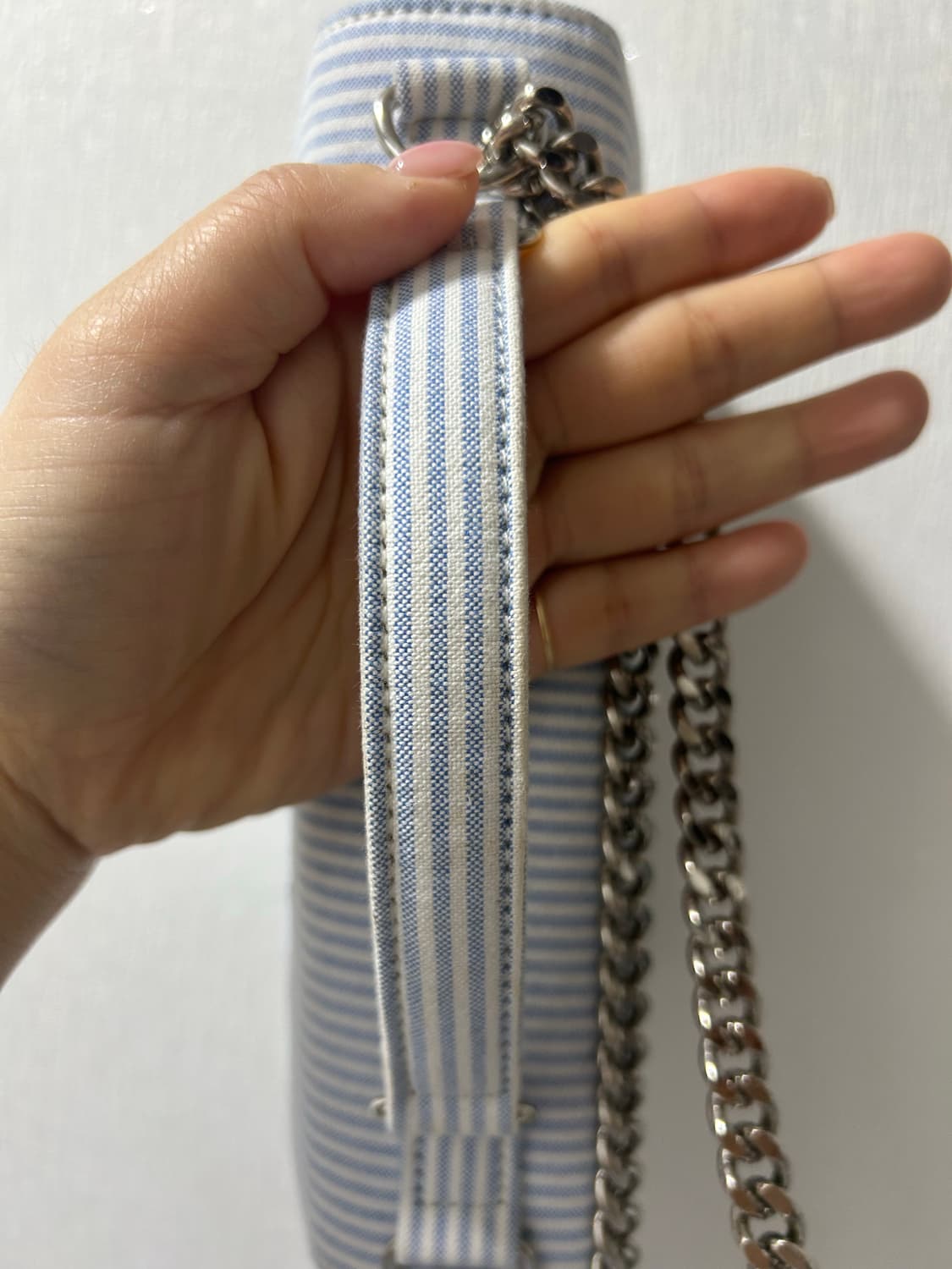 폴로가방이에요 화이트에 베이비블루로 줄무늬 들어가있어요 토트, 크로스, 숄더 모두 가능합니다 업사이클링 입니다 쿨거시 오천원 할인, gs25 반값택배로 무료배송 중고특성상 교환, 환불 불가