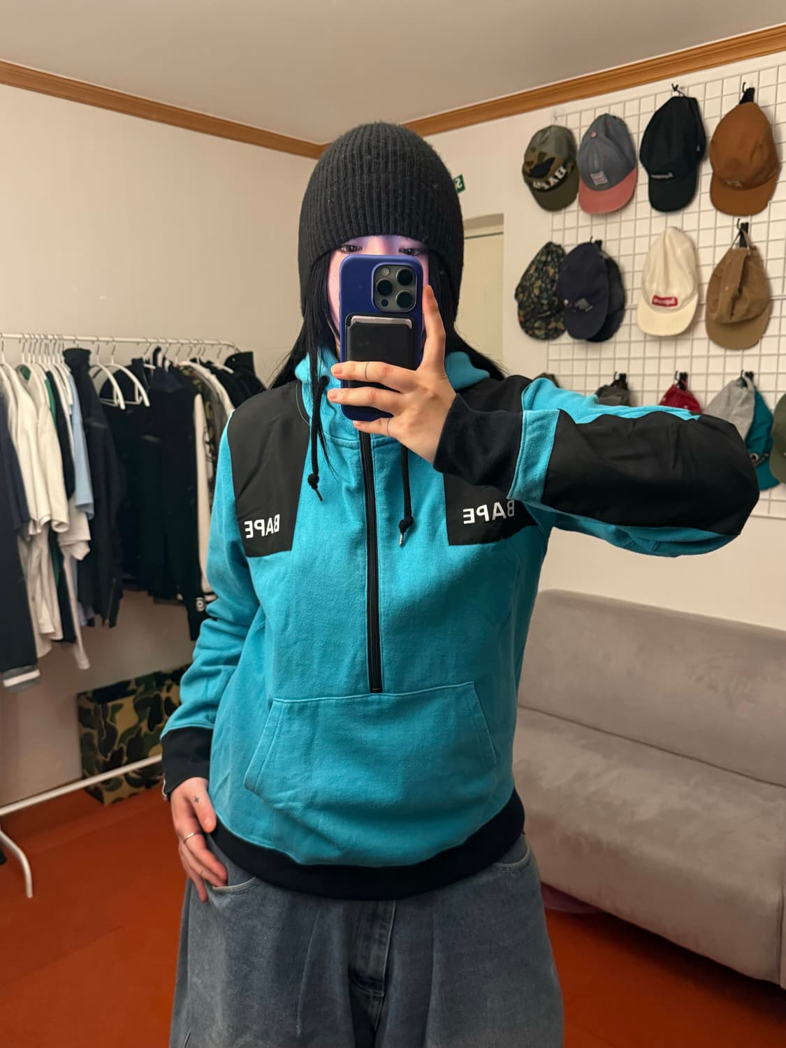 Brand: Bape (blue) Name: Half Zip Hoodie <베이프 하프집업 후드> size: M 총장: 68 가슴: 56 model size: 168cm