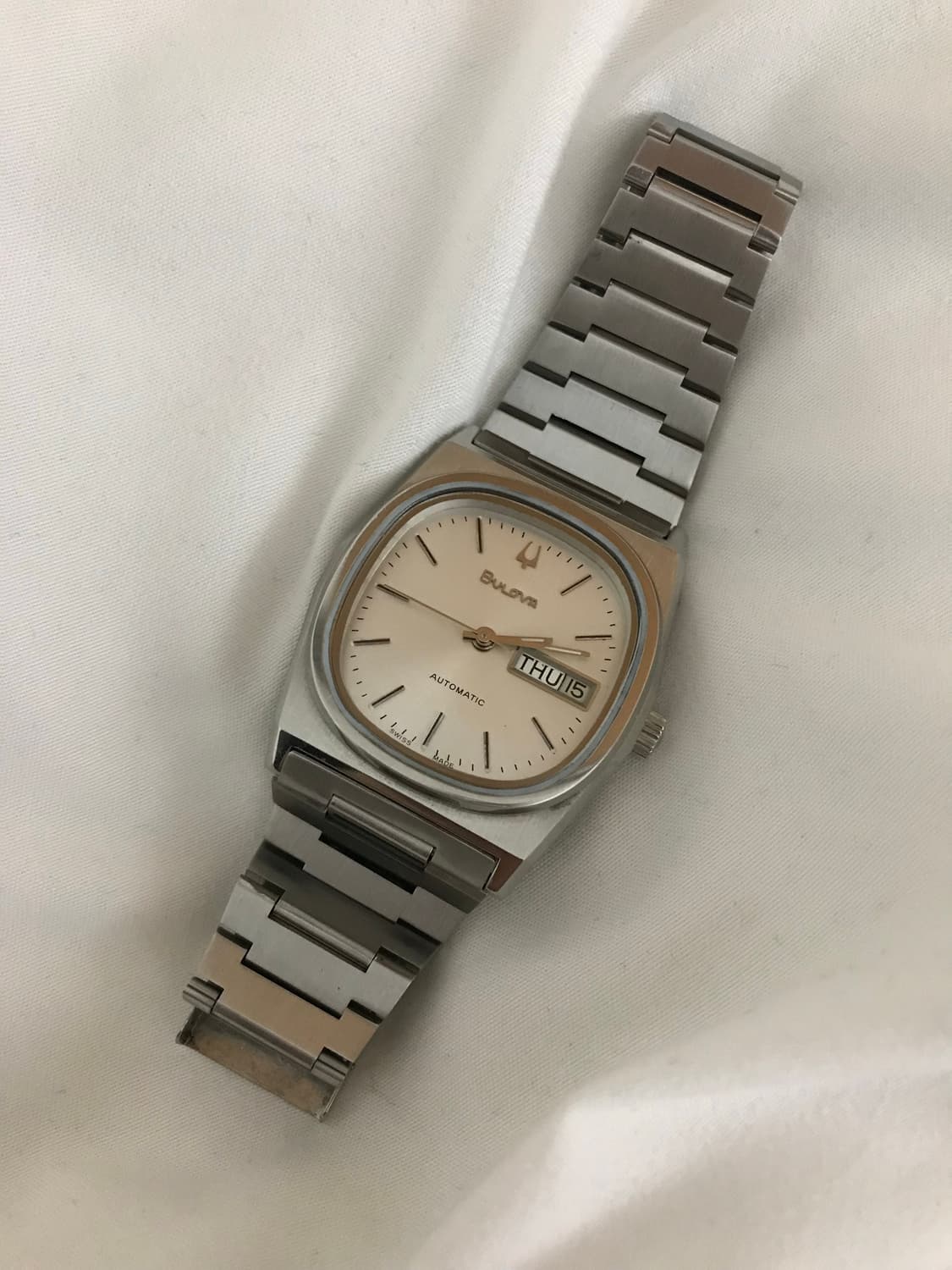 부로바 테레비 오토매틱 시계 판매합니다 현재 매물 많이 없는 제품 중 하나입니다 사각 다이얼이 매력적인 빈티지 시계입니다 스테인리스 스틸과 가죽 스트랩 두 가지 버전으로 연출 가능해요 날짜와 요일 표시 기능도 있습니다 제품안내] -사이즈: 용두 제외한 사이즈 35mm* 35mm -손목둘레 17.5cm , 여분코 있음 -오버홀 24년 4월 완료 • 폴리싱 완료,상태 좋습니다 -구성품: 시계, 가죽스트랩 •특징: 1 자이리톨이나 돼지발톱으로 되어있는 일반적인 테 레비 모델과 달리 가죽스트랩으로 교체용이한 일반적 인 러그와 엔드피스되어있는 모델 ✓ 빈티지 오토매틱 시계 케이스의 외장 및 내장 상태 그리고 무브먼트의 성능에 대한 이해도나 이해를 하실 분들이 구매해주셨으면 좋겠습니다 궁금한점 문의주세요 :)