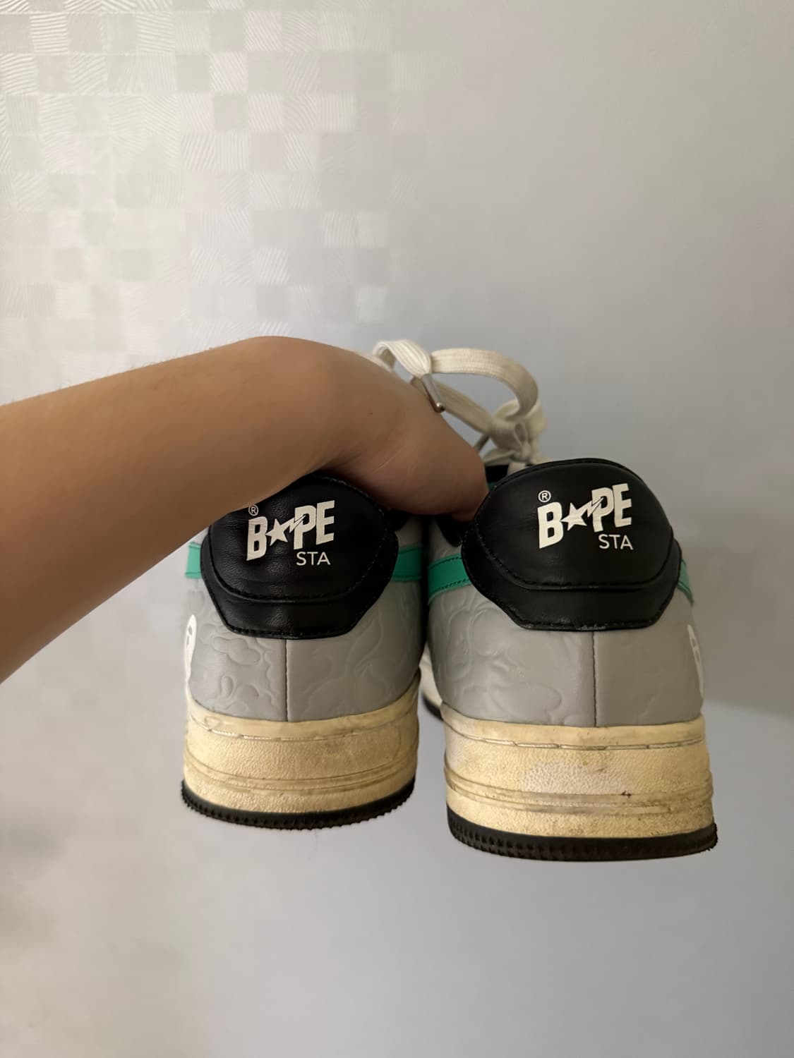 베이프스타 260 사이즈입니다. 민트색과 검은색의 조합이 아름다운 피스이며 베이프 청담 매장에서 구매한지는 되었지만 사용감이 많지는 않습니다. 사진으로 밑창 닳음 정도 확인하실 수 있습니다. 에어포스보다 퀄리티 좋은 베이프스타를 이 컬러로 입문하는 건 어떨까요? 가격은 15만원입니다.