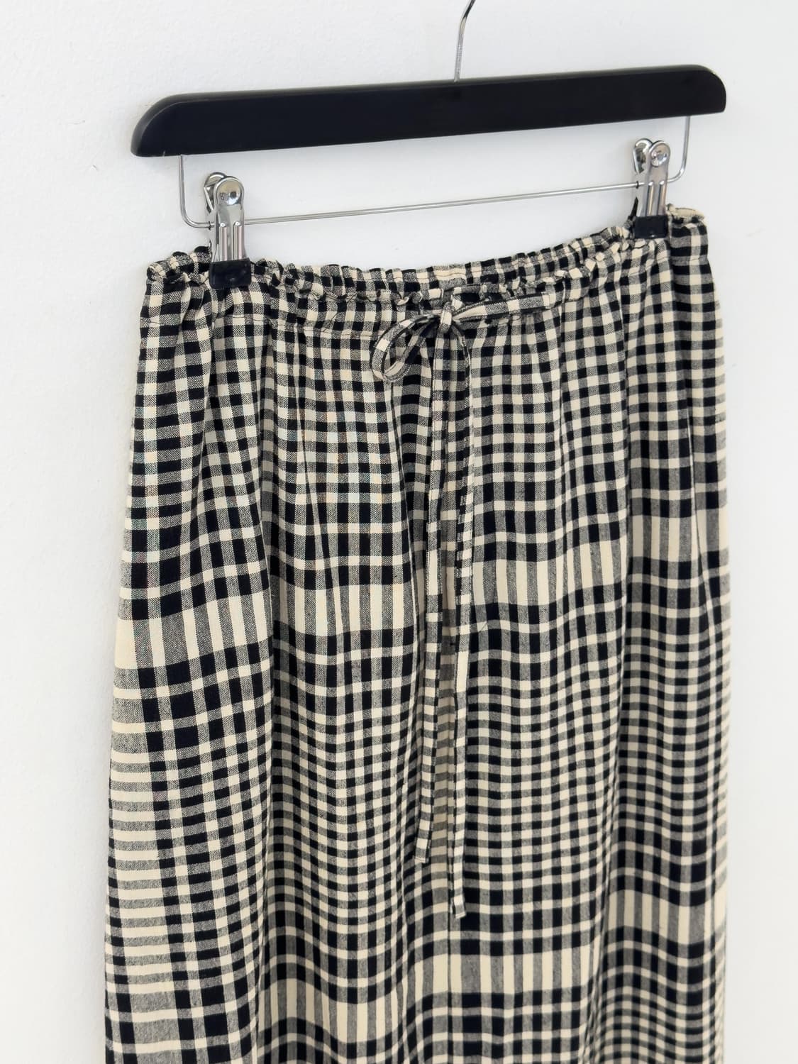 요지야마모토의 Y's for living 스커트 입니다. 모던한 체크 패턴과 루즈한 실루엣이 매력적인 아이템 입니다. 여유로운 프리 사이즈로 누구나 예쁘게 입으실 수 있습니다. 실측 단면 사이즈 (측정 방식에 따라 1-2cm 오차가 있을 수 있습니다) 허리 끈조절 free 총장85cm Rayon62% linen27% poly11%