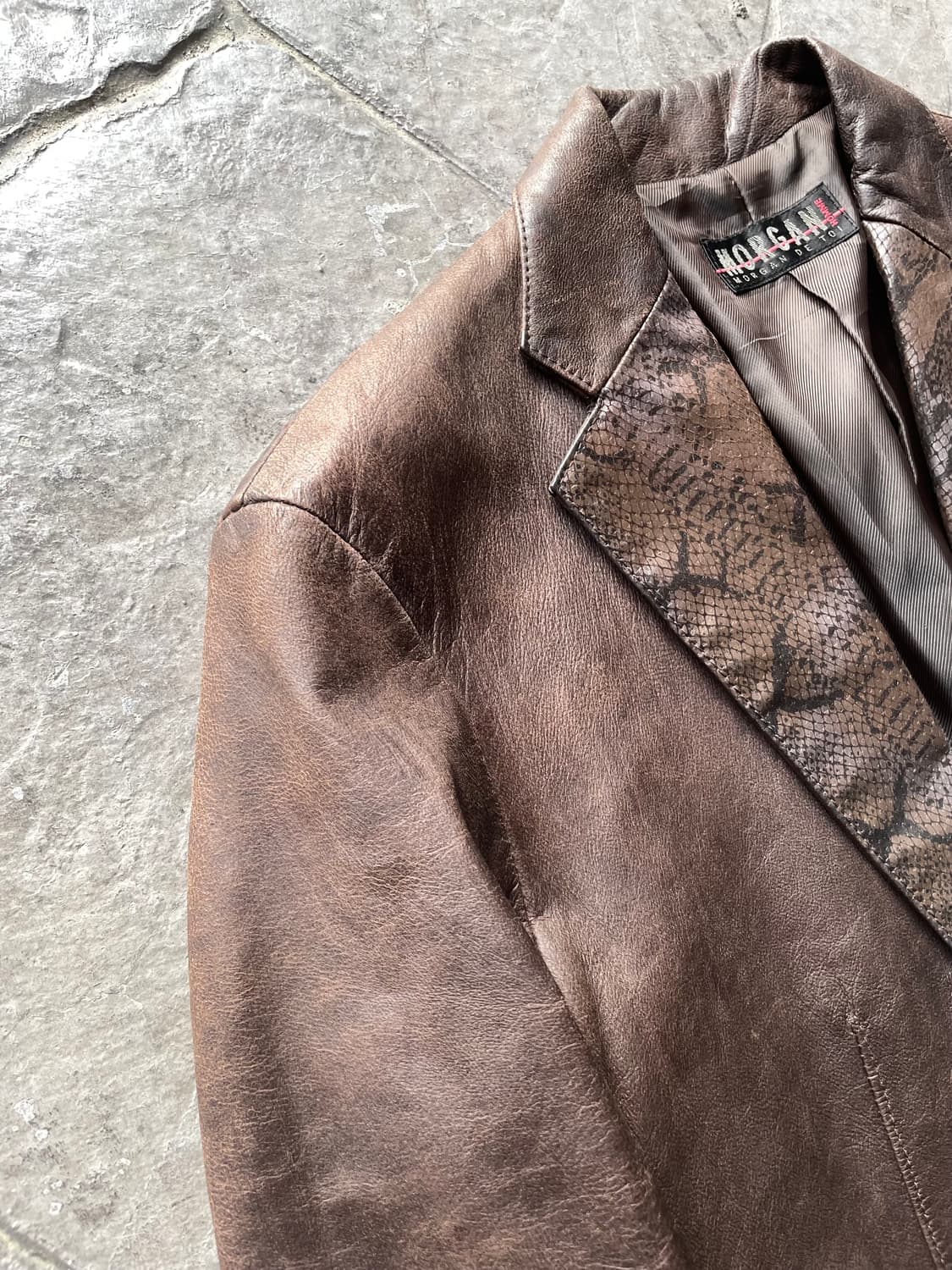 MORGAN HOMME goat skin leather blazer 프랑스발 브랜드 MORGAN의 HOMME 라인 레더 블레이져 탄탄한 고트 레더 바디, 스네이크 텍스처의 파츠는 피그 레더 사양 자연스러운 에이징이 발군인 모델입니다. 어깨 44 가슴 48 총장 73 팔 60 (cm)