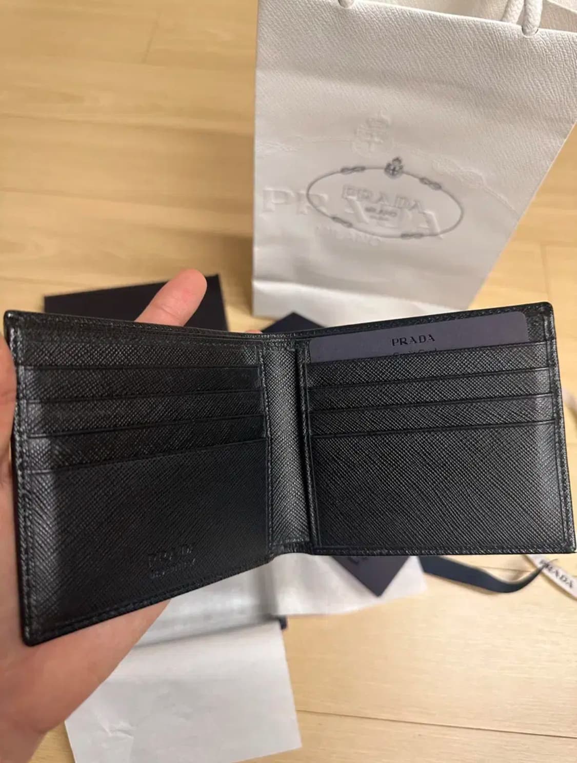 프라다 사피아노 트라이앵글 반지갑(남성) 미니 트라이앵글이 붙은 스테디셀러 반지갑입니다. 겉감 천연 송아지100% 가죽, 안감은 100%레이온입니다. 품질보증서 및 쇼핑백리본까지 풀 패키지로 보관중이며, 사진에서 보이듯 거의 새상품에 가까우므로 상태가 매우 좋습니다. 현재 프라다 공홈가격 99만원입니다. 품질보증서 2020년 제품입니다.