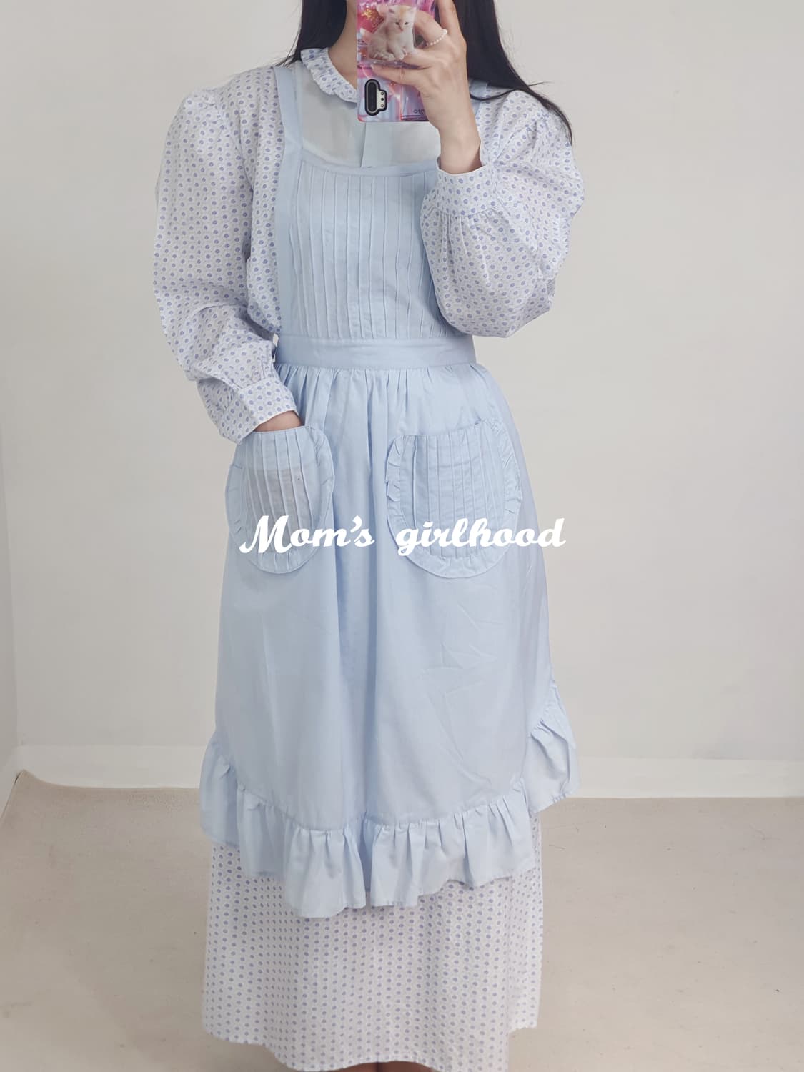 잔잔한 주름 디테일과 곡선 포켓, 밑단 프릴이 어우러진 러블리한 무드의 빈티지 스타일 앞치마입니다. 청량한 하늘색 컬러와 부드러운 코튼 혼방 소재로 가벼운 착용감은 물론, 데일리한 홈웨어 스타일링에도 잘 어울려요. 홈카페, 작업실, 촬영용 소품 등 사랑스러운 무드를 담고 싶은 공간에 어울리는 에이프런이에요. ※ 오래된 세월감으로 인해 가슴부분에 부분적으로 미세한 색바램이 있습니다.