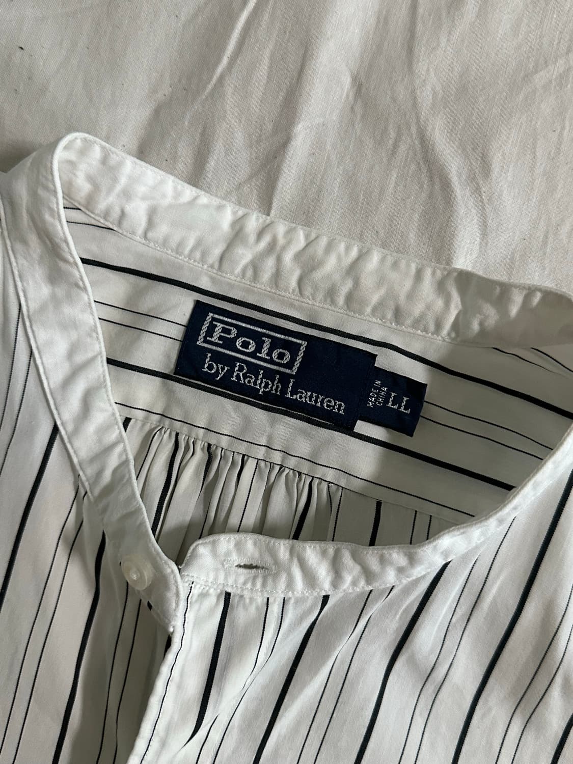 아메리칸 캐주얼 브랜드 폴로랑프로렌의 스트라이프 셔츠입니다. 밴드칼라, 라운드헴, 소매 및 뒷면 셔링으로 더해진 입체감 등 디자인과 퀄리티 훌륭합니다. 매우 좋은 컨디션으로 표기 LL사이즈, 체감 남성 100-105 사이 정도입니다. 가슴단면 58cm 어깨단면 46cm 팔길이 59cm 총길이 80cm (측정 방법에따라 조금씩 차이날수도 있습니다) * 교환 환불 불가 * 미처 발견하지 못한 데미지 및 오염이 존재할 수 있으니 신중한 구매 부탁드립니다.