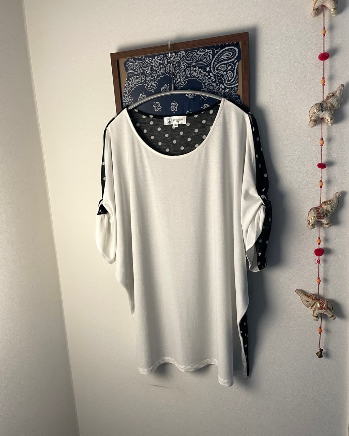 [color] white, black [size] 38 [fabric] 레이온 66% 폴리에스테르 31% 폴리우레탄 3% [measurement] 어깨-팔 30 가슴 68 총장 68 [model size] 165 / s-m * 레이온,폴리 혼방소재로 탄력감 있으면서도 차르르 흐르는 소재감 * 전면부 깨끗한 화이트 컬러에 후면부 도트 패턴 디자인으로 은은하게 포인트가 되어줍니다. * 어깨부터 내려오는 팔 부분 트임 디테일