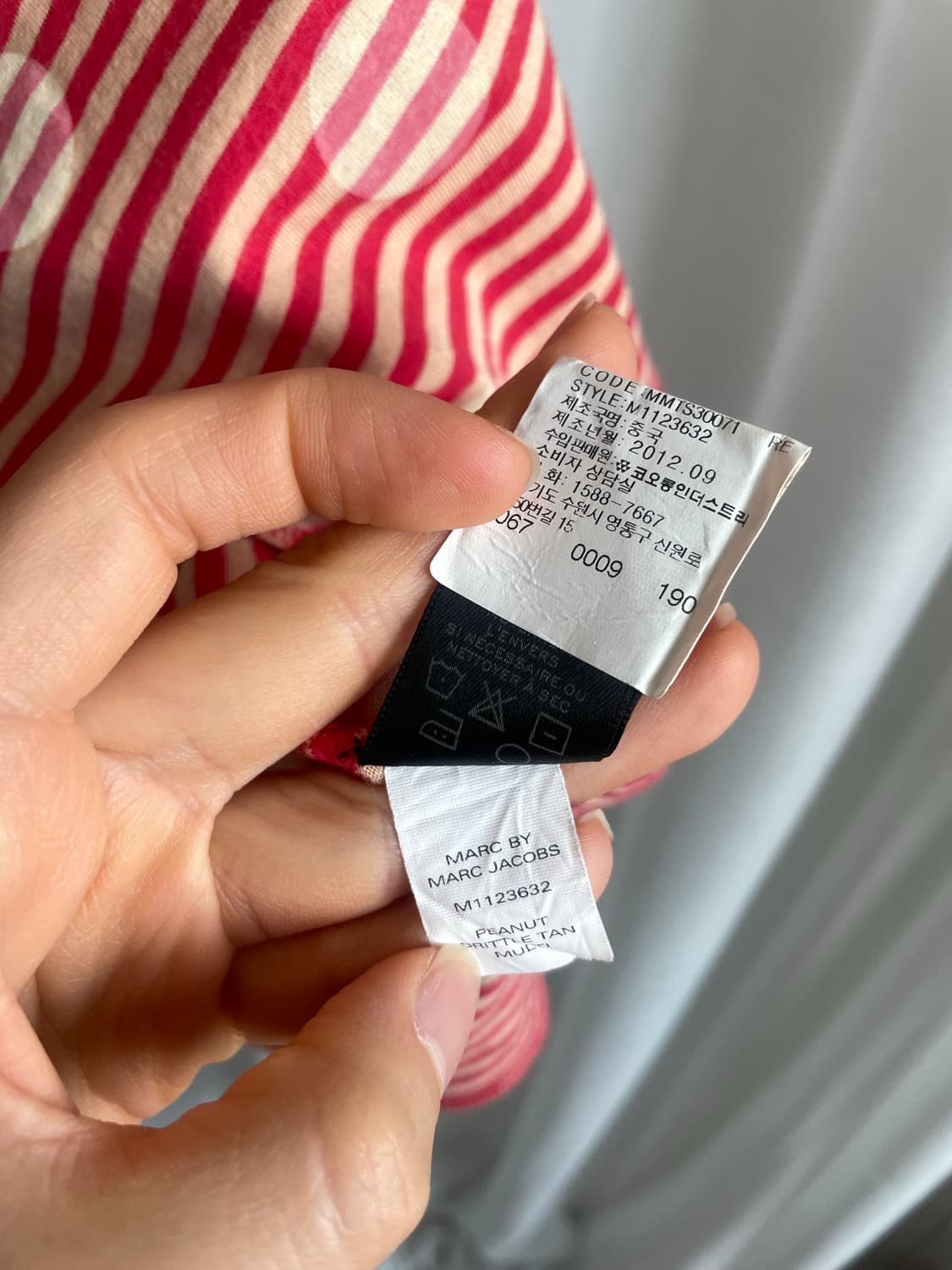 가단 40 총장 52 어깨 33 소매 7 Condition: 오염이나 하자 없음. 옆 트임이 포인트인 마크제이콥스 도트 스트라이프 티셔츠입니다. 소매가 짧아서 페미닌한 느낌을 줄 수 있으며, 귀여운 색감으로 발랄함을 더해줍니다.