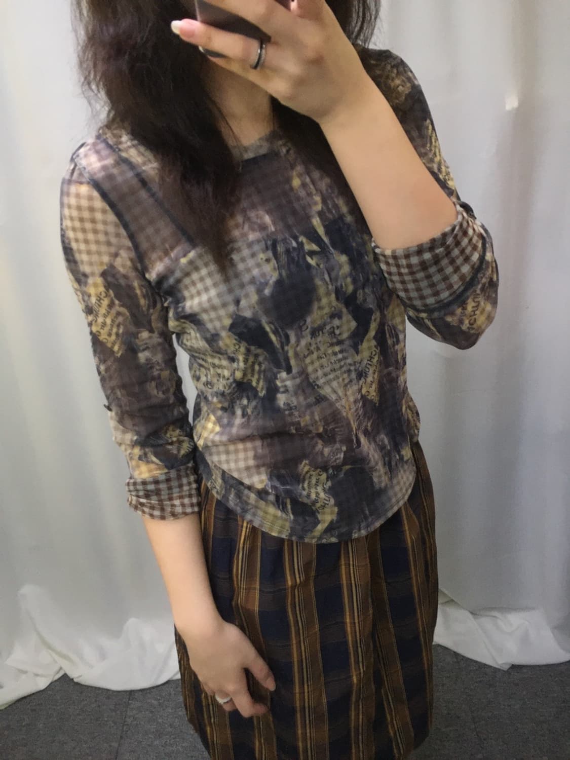 어깨 32 / 가슴 40 / 소매 63 / 총장 55 폴리에스테르100% -여유로운 스트레이트 핏 -시스루 소재 -소매 기장 조절 가능한 단추 버튼 디테일 -유니크한 패턴 -사계절 착용 가능 -컨디션 9/10 모델 사이즈 •163 / 55 size ( 하체 발달형 ) @goul.vint