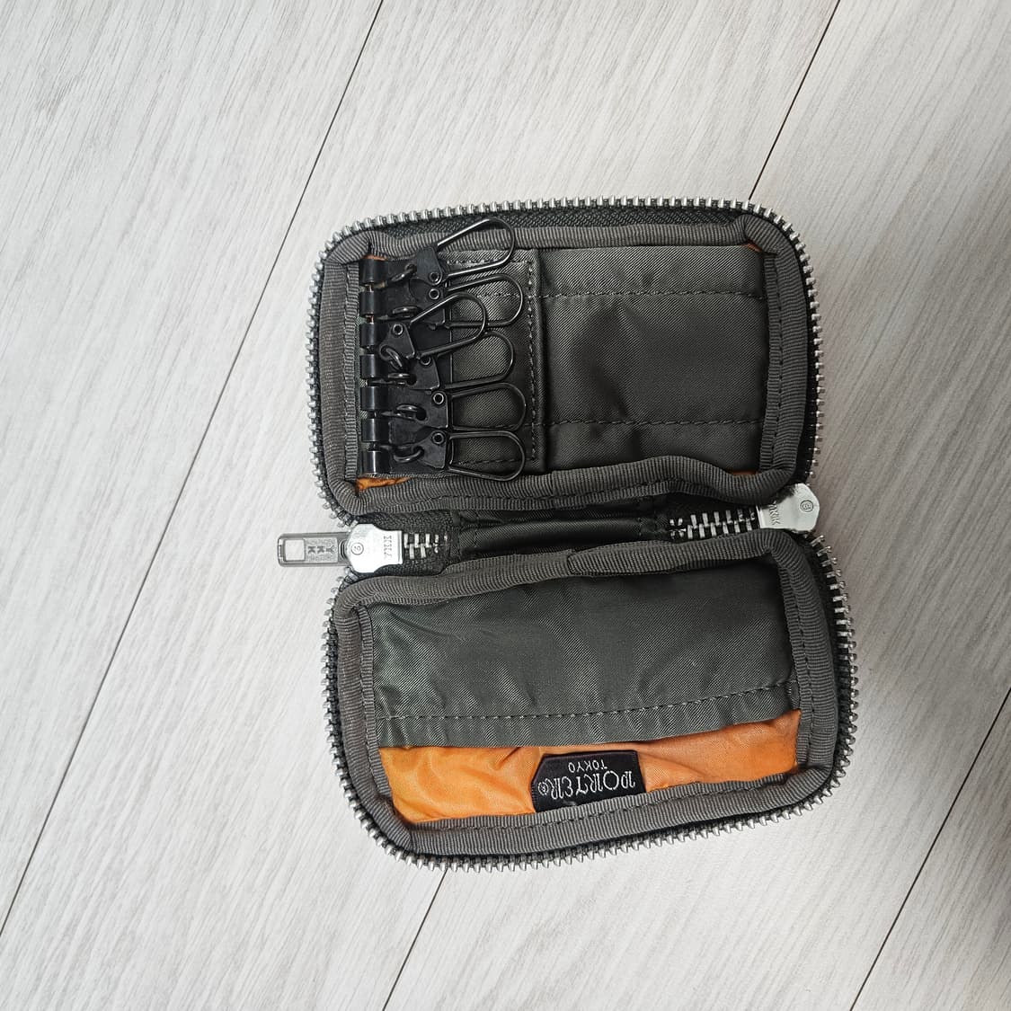 브랜드: PORTER / Yoshida & Company 모델: TANKER Key Case 색상: Sage Green (세이지 그린) 소재: 고밀도 나일론 트윌 / 오렌지 안감 / 금속 키 후크 구성: 4연 키 훅 + 포켓 수납 + 지퍼 포켓 지퍼: YKK 정품 실버 지퍼 상태: 전반적으로 양호 / 약간의 생활감 있음