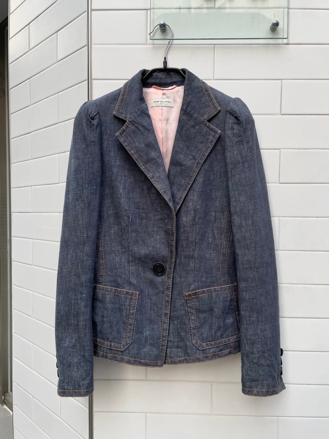DRIES VAN NOTEN puff shoulder denim jacket 앤프워프 식스 디자이너 드리스 반 노튼의 우먼스 데님 자켓 내추럴한 색상의 데님 소재, 퍼프 숄더 사양의 원 버튼 모델 좋은 컨디션입니다. 어깨 34 가슴 44 총장 57 팔 63 (cm)