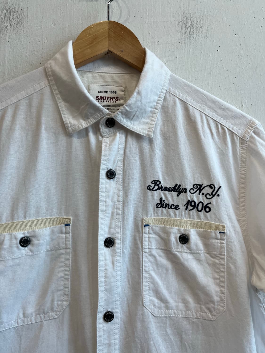 스미스 아메리칸 린넨 블렌디드 반팔 셔츠 M - 미국발 캐주얼 워크웨어 전문 브랜드 스미스 아메리칸의 린넨 블렌디드로 시원하게 착용 가능한 반팔 셔츠 - 좋은 컨디션 어깨43 가슴단면52 총장70~72 팔길이21 250530
