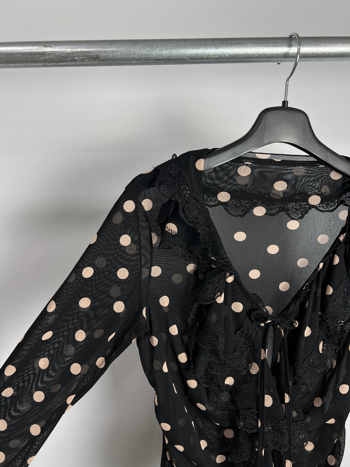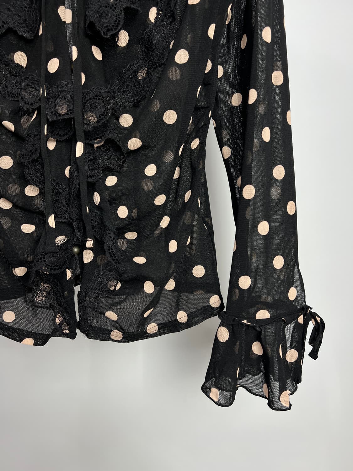 11275 어깨37 가슴41 팔58 총장53(cm) 도트 블라우스 입니다. 씨스루한 폴리 소재이며 도트, 레이스, 프릴, 셔링 등 다양한 디테일이 돋보이는 제품이네요. 사이즈는 실측을 참고해 주세요!