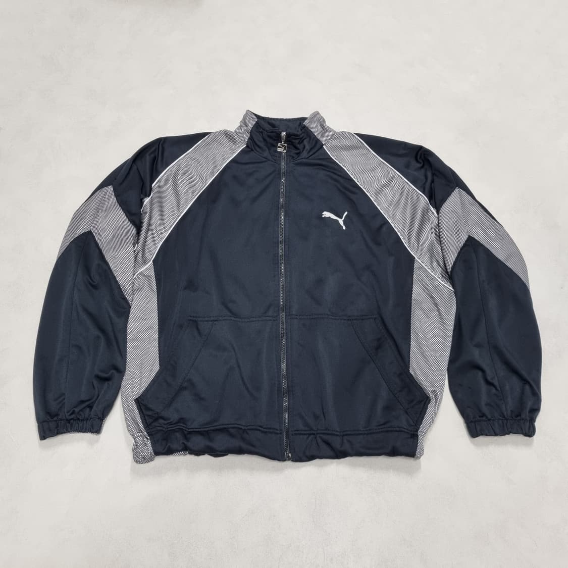 유니크한 감성의 퓨마 트레이닝 자켓 블랙+실버 컬러, 져지 원단 오버 사이즈 핏 소매 데미지 존재 사이즈탭 XL 어깨 나그랑 x, 가슴 74cm, 기장 73cm (기장은 카라깃을 제외한 길이 입니다.) 중고 제품 특성상 교환 및 환불이 불가합니다. #빈티지 #퓨마 #푸마 #puma #트랙탑 #져지 #올드스쿨 #스트릿 #나이키 #아디다스
