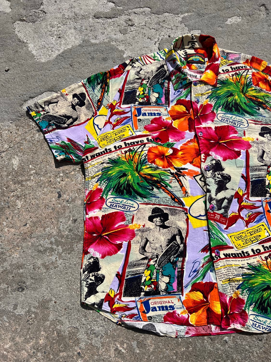 JAMS WORLD FULL ARTWORK HAWAIIAN SHIRT Made in usa 1964년 하와이에서 설립된, 역사와 전통이 깊은 브랜드 잼스월드, 특유의 레이온소재로 편안한 착용감과 우수한 통기성이 특징인 셔츠 제품입니다. 독특하고 유니크한 아트워크 그래픽이 한가득 들어가있으며 브랜드 특유의 단추디테일이 특징으로 돋보입니다. 오염이나 찢어짐없이 좋은 컨디션입니다. 표기 : XLARGE 국내110정도 길이76/83 가슴단면72.5 어깨57 팔길이27.5