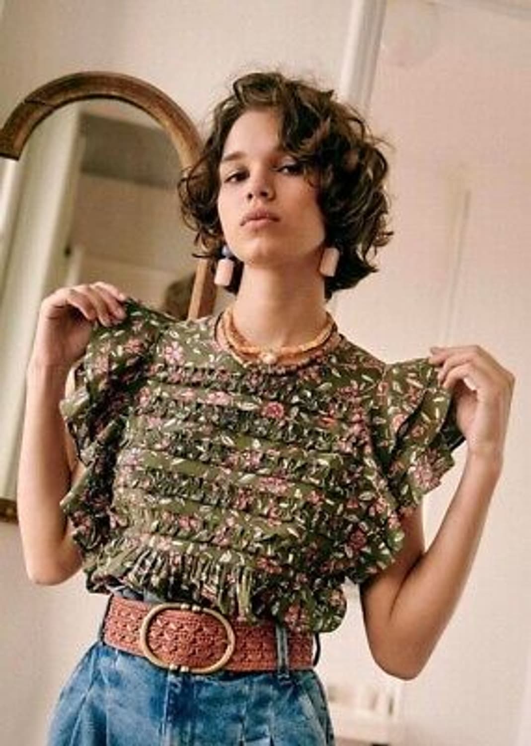 (새상품) 세잔 플로럴 프릴 블라우스 34사이즈 카키 색상에 분홍색 플로럴 디자인이 더해져 독특한 프린팅 이 매력적이고요. 계단식으로 프릴 소매가 더해져 사랑스러움이 가득 더해졌어요. 면 100% 소재에 모델도 34사이즈 착용했고 핏되는 스타일이 아니라 편하게 입으실 수 있답니다 택있는 새상품이라 선물도 가능해요