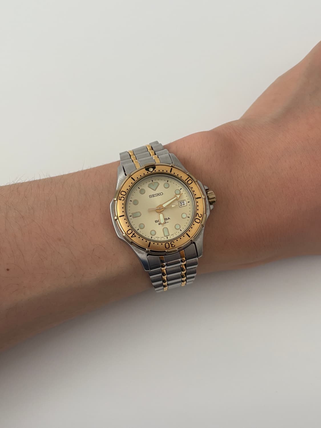 SEIKO - 90s scuba champagne dial combi diver quartz ​ *사이즈: 가로(용두 제외): 39/러그투러그: 44/스트랩(가로: 19 둘레: 180) (mm) ​ *컨디션: 아주 좋은 컨디션 (시계 단품/정상 작동)
