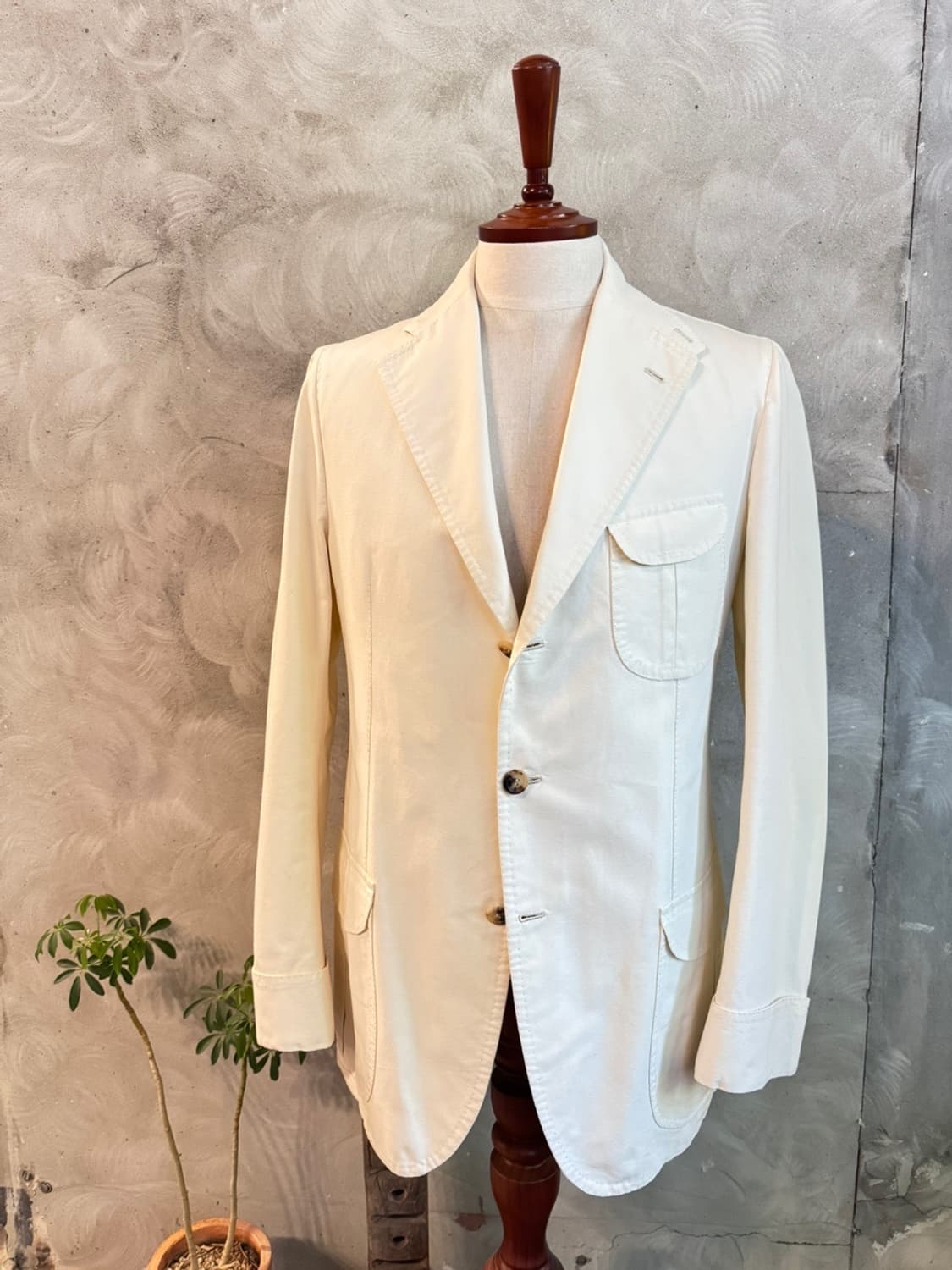 풀핸드의 손맛만으로 연출된 오라지오 루치아노 스포츠코트입니다. 미색의 코튼 패브릭 위에 뜬 저 포켓들의 만듦새들이나 커프스 디테일 등 고전미 풍부한 스포츠코트를 찾는 분이라면 응당 흡족할 명작입니다. 사이즈 국내 100 추천합니다. 감사합니다.